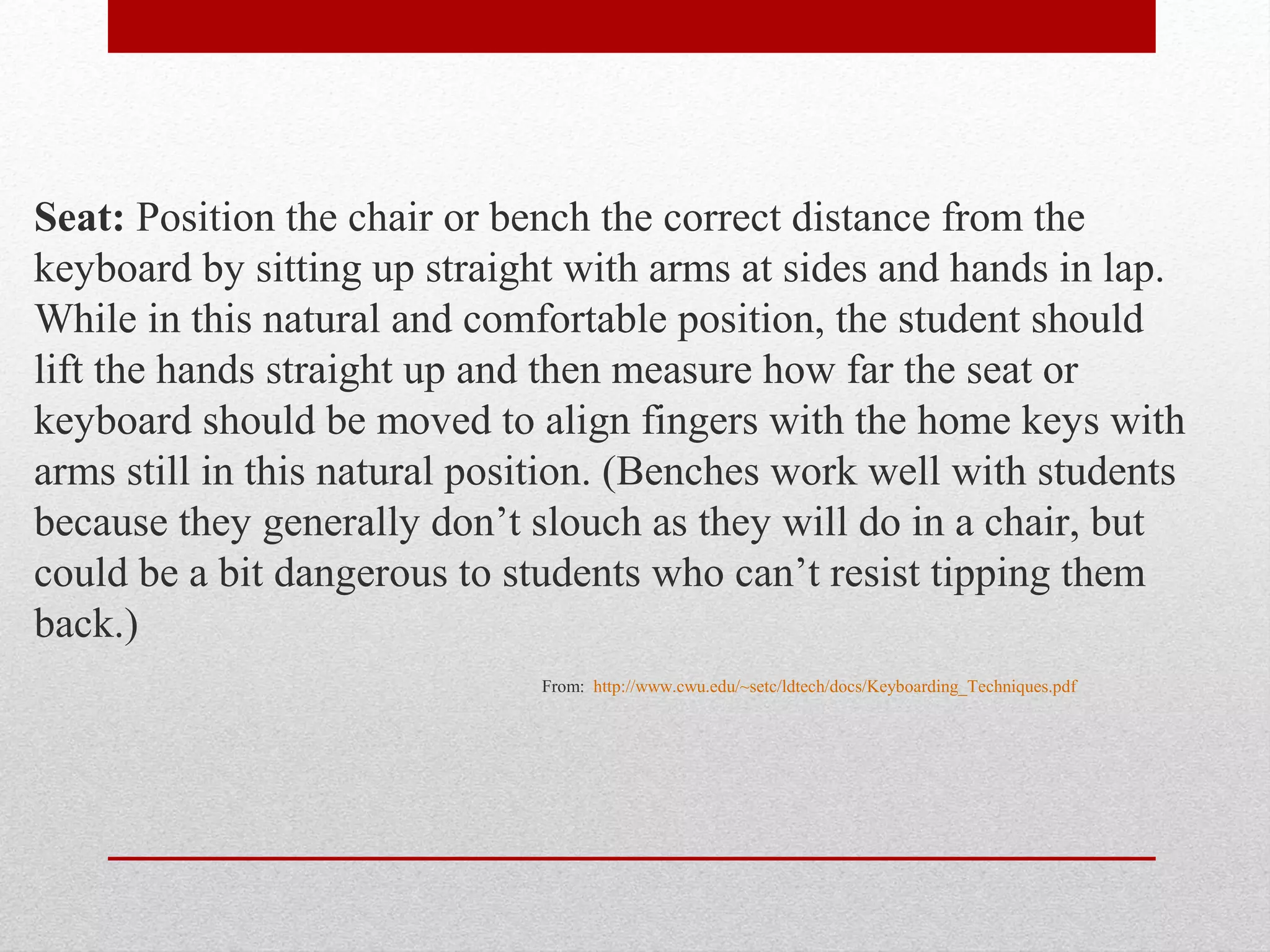 This document provides instructions for proper typing posture and technique. It discusses positioning the chair, hands, and monitor for ergonomic typing. The home row keys (ASDF and JKL;) should be learned first using the correct left and right hand fingers (index, middle, ring, and pinkie). Exercises are presented to practice these home row keys individually and together, focusing on using the right fingers without looking down at the keyboard. The next typing class will cover the top row keys.