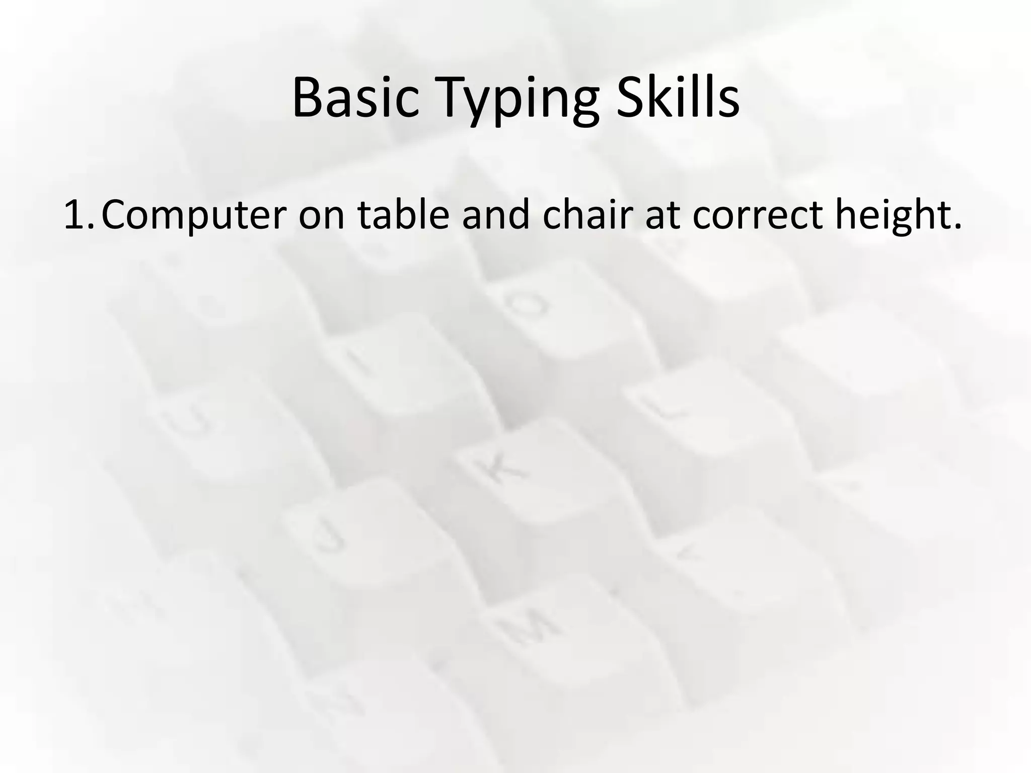 This document provides instructions for basic typing skills and proper typing technique. It emphasizes that students should sit up straight with their feet flat on the floor, keep their hands relaxed on the home row keys, and focus initially on developing proper technique over speed or accuracy. Wrist injuries are avoided by keeping wrists straight and cushioned. The "QWERTY" keyboard layout and home row keys are explained. Students are assigned a typing practice activity and quiz to reinforce these techniques.