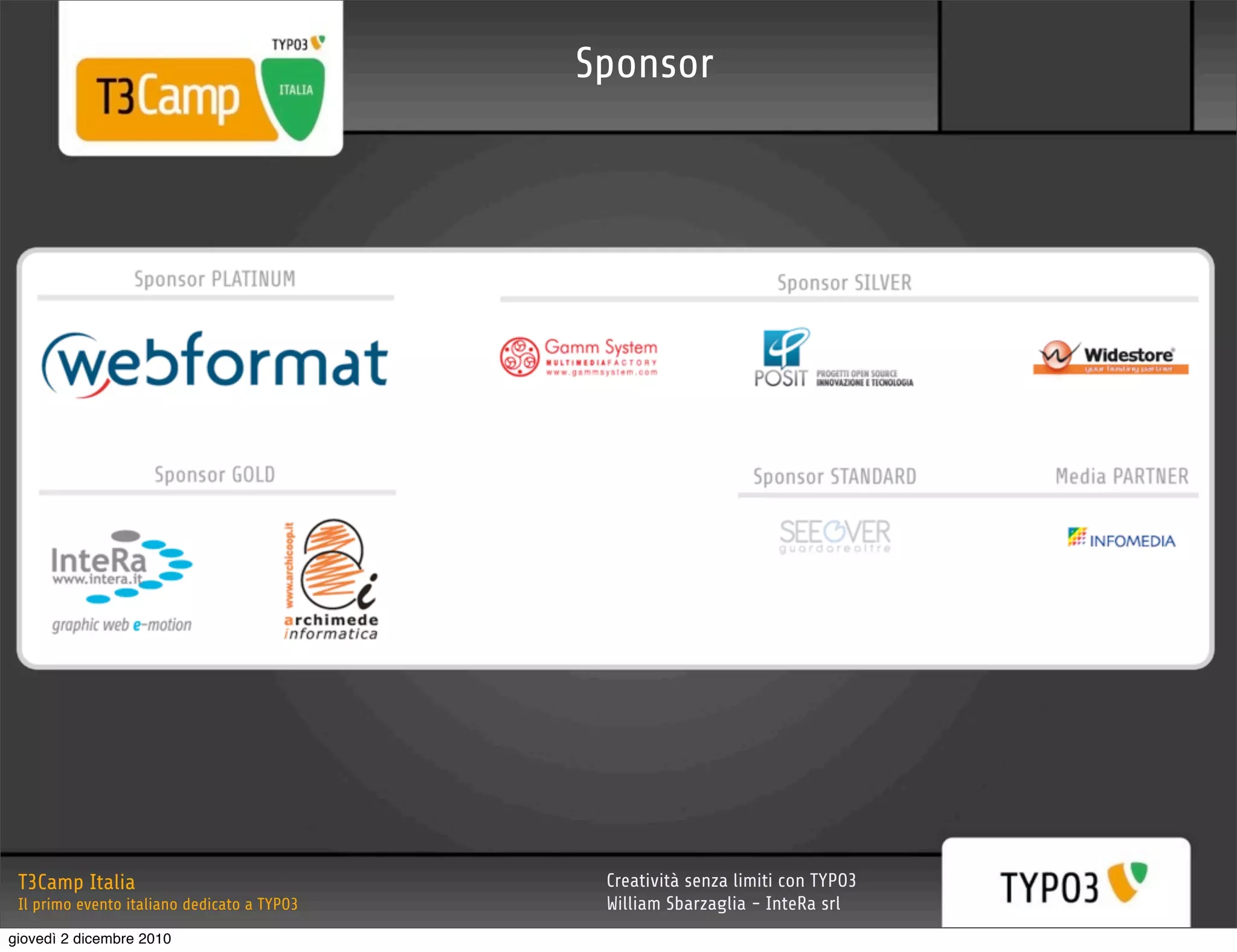 Il t3camp Italia, organizzato da William Sbarzaglia e dedicato a TYPO3, si è svolto a Bologna il 26 e 27 novembre 2010, con un focus sull'ottimizzazione SEO per i siti web. L'evento ha trattato vari aspetti del SEO applicato a TYPO3, inclusa l'importanza delle keyword e le estensioni utilizzabili per migliorare il posizionamento nei motori di ricerca. Sbarzaglia, esperto di TYPO3 con oltre dieci anni di esperienza, ha condiviso strategie per ottimizzare i progetti web e migliorare il ROI attraverso l'uso efficace del CMS TYPO3.
