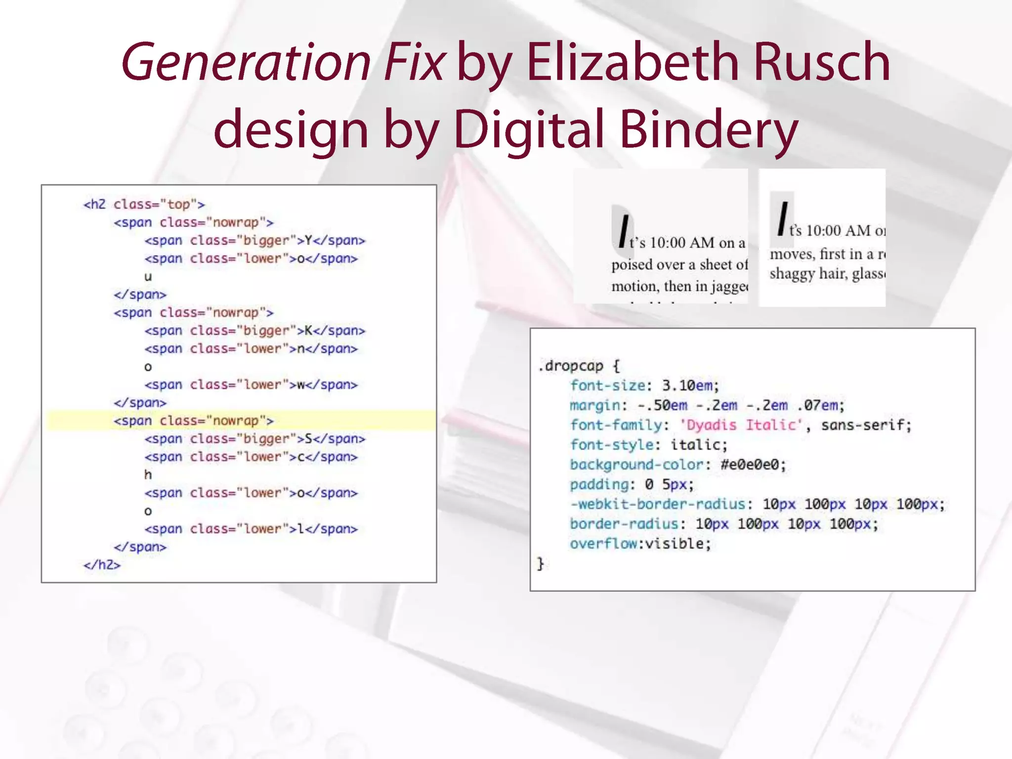 The document summarizes a show and tell session on ebook typography. It includes tips from various designers on techniques like embedding fonts, hyphenation, pagination, images, and media queries. Examples are provided for techniques like adding thin spaces around em dashes, styling footnotes and captions, and reflowing inline elements. A list of recommended books designed by the presenters is also included.