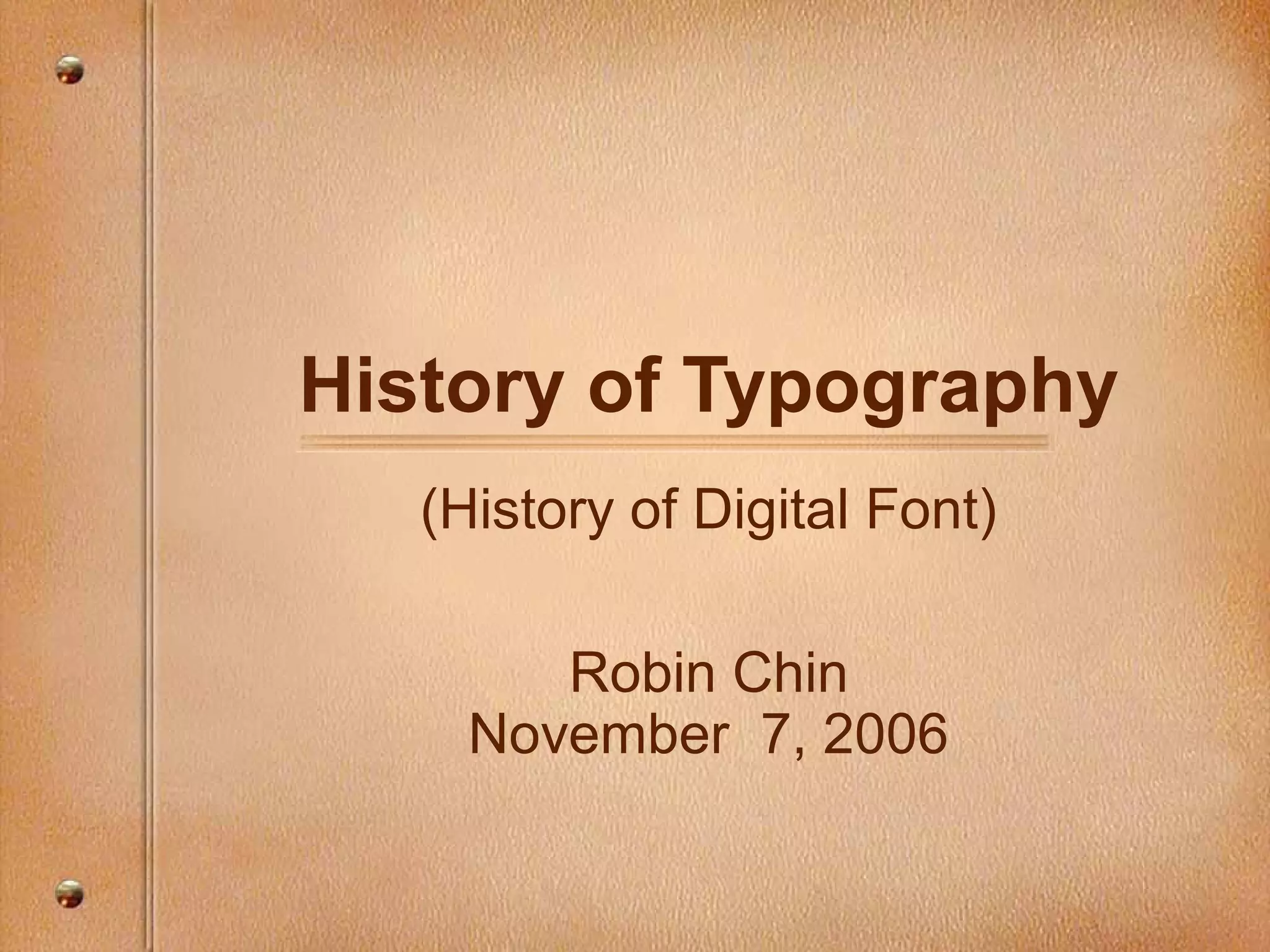 This document provides a history of typography from print to digital formats. It discusses the origins of typography in print, with Johannes Gutenberg creating the first metal movable type in the 15th century. Modernist typographers in the early 20th century experimented with size, spacing and design to encourage new values. Digital typography later borrowed from print typefaces but also allowed new possibilities with layout and multimedia. The development shows typography must relate to its functional purpose and reading environment in each era.