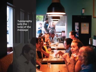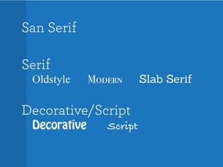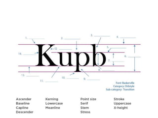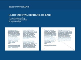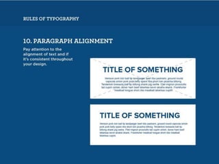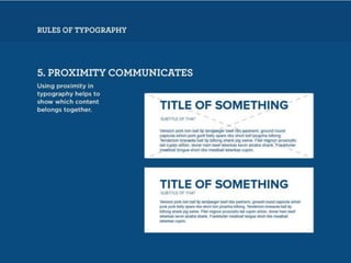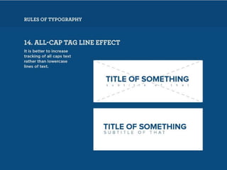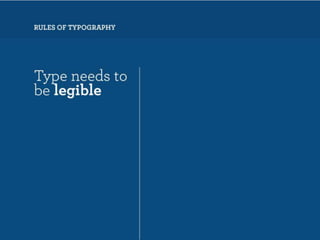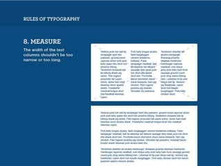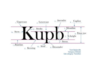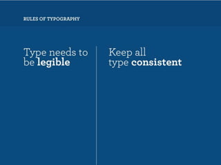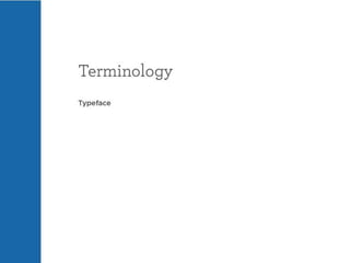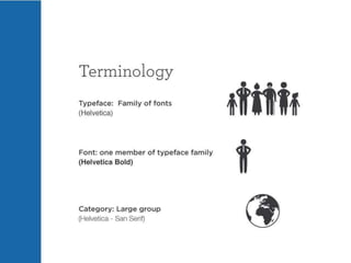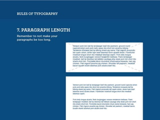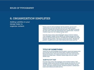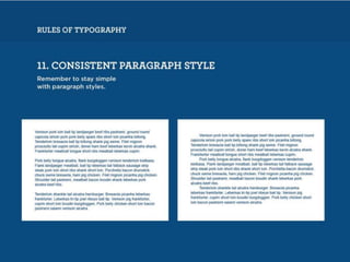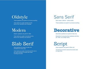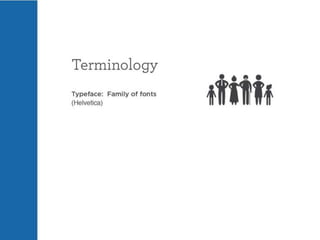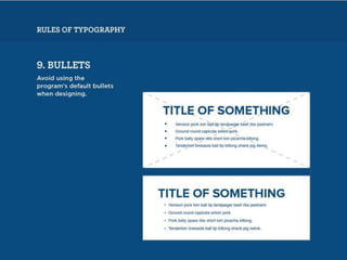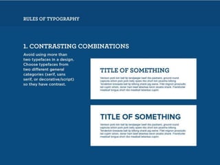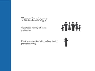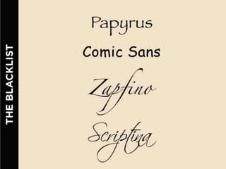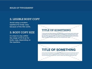 The document discusses guidelines for choosing typography. It recommends avoiding decorative or overused fonts like Helvetica Neue, Gill Sans, and Times New Roman. Instead, it suggests using clean, simple fonts. The document also advises not to hyphenate words or stretch text out of proportion, and to use only one space after periods. Finally, it mentions typography terms like leading, kerning, and tracking that are important to consider.