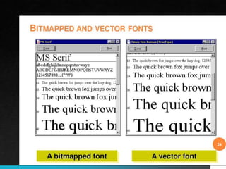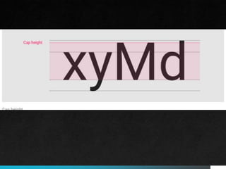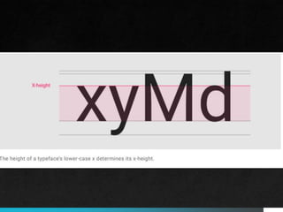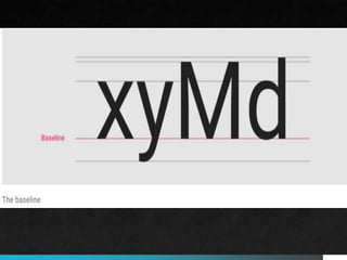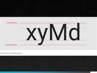 This document provides an introduction to typography and font design. It discusses key typography concepts like fonts versus typefaces, hierarchy, contrast, consistency, whitespace, and alignment. It explains typographic elements like baselines, cap heights, x-heights, ascenders, and descenders. The document covers type classification, font effects, bitmap versus scalable fonts, and popular font editing tools. Overall, it serves as a comprehensive guide to understanding typography fundamentals and principles of font design.