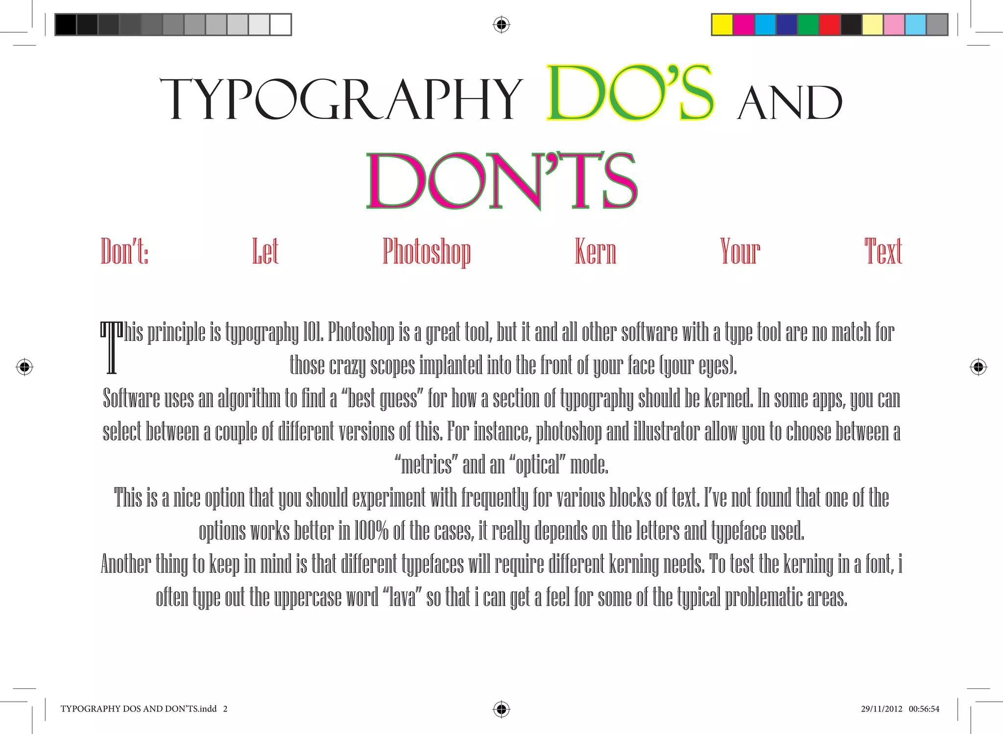 The document provides several dos and don'ts for typography. It recommends manually kerning important text rather than relying solely on automatic kerning. It advises against letting Photoshop kern text and suggests choosing fonts that fit the tone and audience. The document also stresses the importance of consistency, simplicity, and avoiding busy backgrounds or hard-to-read fonts.