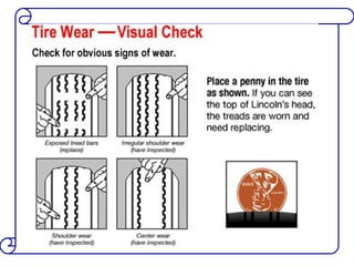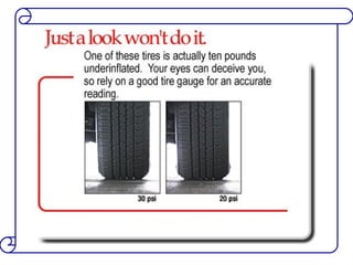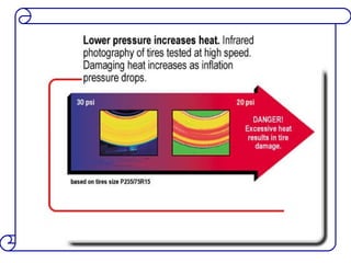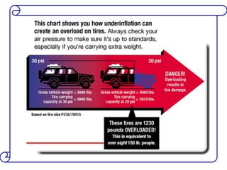 Proper tire maintenance such as regularly checking and inflating tires to the proper pressure is important for safety and performance. Key information found on tires includes temperature resistance ratings, treadwear numbers, traction ratings, maximum load capacity, speed symbol, and manufacturing date. Maintaining proper tire pressure and avoiding overloading tires can improve handling, protect from accidents, improve fuel economy, and increase tire life.