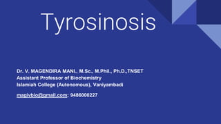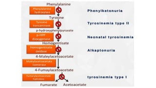 Tyrosinosis is a genetic disorder caused by enzyme deficiencies that disrupt normal metabolism, leading to toxic accumulation of tyrosine and its byproducts, resulting in serious health issues. There are three types of tyrosinemia, each linked to different enzyme deficiencies, with type I being the most severe, potentially causing liver failure or cancer. Diagnosis includes elevated levels of tyrosine in the blood and urine, and treatment involves the use of nitisinone and dietary management to control tyrosine levels.