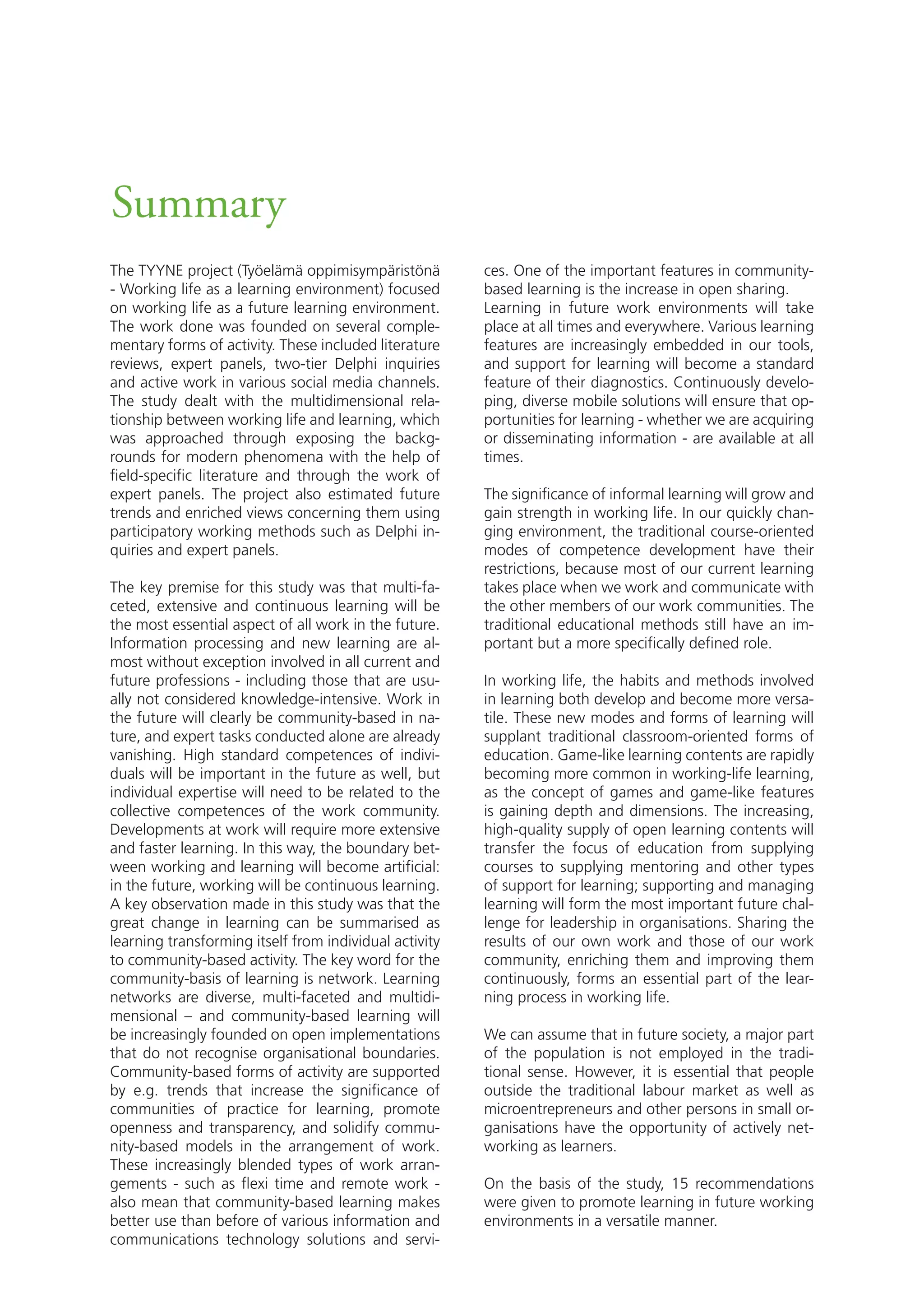 The TYYNE project focused on working life as a future learning environment. It found that learning is transforming from an individual activity to a community-based one, where informal learning and networks will play a bigger role. Communities of practice and open sharing of learning resources are important. New technologies will make learning possible anywhere and anytime. Leadership must support shared, experimental learning in work communities. The project recommended supporting learning networks, communities of practice, competency-based qualifications, and new leadership models to promote versatile, lifelong learning in evolving work environments.