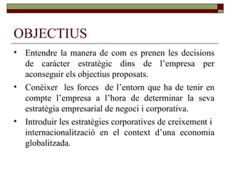 OBJECTIUS Entendre lamanera de com es prenen les decisions de caràcter estratègic dins de l’empresa per aconseguir els objectius proposats. Conèixer les forces de l’entorn que ha de tenir en compte l’empresa a l’hora de determinar la seva estratègia empresarial de negoci i corporativa. Introduir les estratègies corporatives de creixement i internacionalització en el context d’una economia globalitzada.