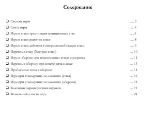 Отчет анализирует игру команды, подробно описывая её систему и стиль, основанные на схеме 4-3-3. Рассматриваются ключевые аспекты атакующей и оборонительной стратегии, включая организацию позиционных атак, переходы в атаку и действия при стандартных положениях. Документ также содержит рекомендации по возможной ротации игроков и коррекции их действий в зависимости от ситуации на поле.