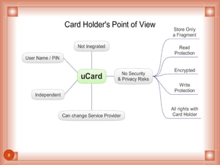 The document proposes a novel universal loyalty card called uCard that provides enhanced privacy and security compared to existing cards. uCard would allow a user to consolidate various loyalty programs, payment methods, and digital identities into a single card. It describes the basic architecture and interactions of uCard, including how users could subscribe to and unsubscribe from services, update information, and recover from lost or corrupted cards, all while protecting user privacy through encryption.