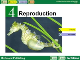 This document discusses various types of reproduction including asexual reproduction through budding, fragmentation, and spore formation. It also discusses sexual reproduction which requires two parents and results in offspring with genetic material from both. Sexual reproduction can occur externally or internally. The life cycles of plants and animals are also summarized, including embryonic development through viviparity, oviparity, and ovoviviparity. Post-embryonic development can be direct or involve metamorphosis. The document also provides examples of plant reproduction through vegetative reproduction, artificial methods, and sexual reproduction involving pollination, fertilization, and seed germination.