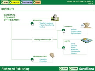 The document discusses various natural processes that shape the Earth's surface over time. It describes how weathering breaks rocks down into sediments through mechanical, chemical and biological means. It then explains different erosional agents like water, wind, glaciers that transport these sediments and deposit them in new locations through processes like sedimentation. It provides examples of specific landforms created by these forces like valleys, deltas, and dunes.