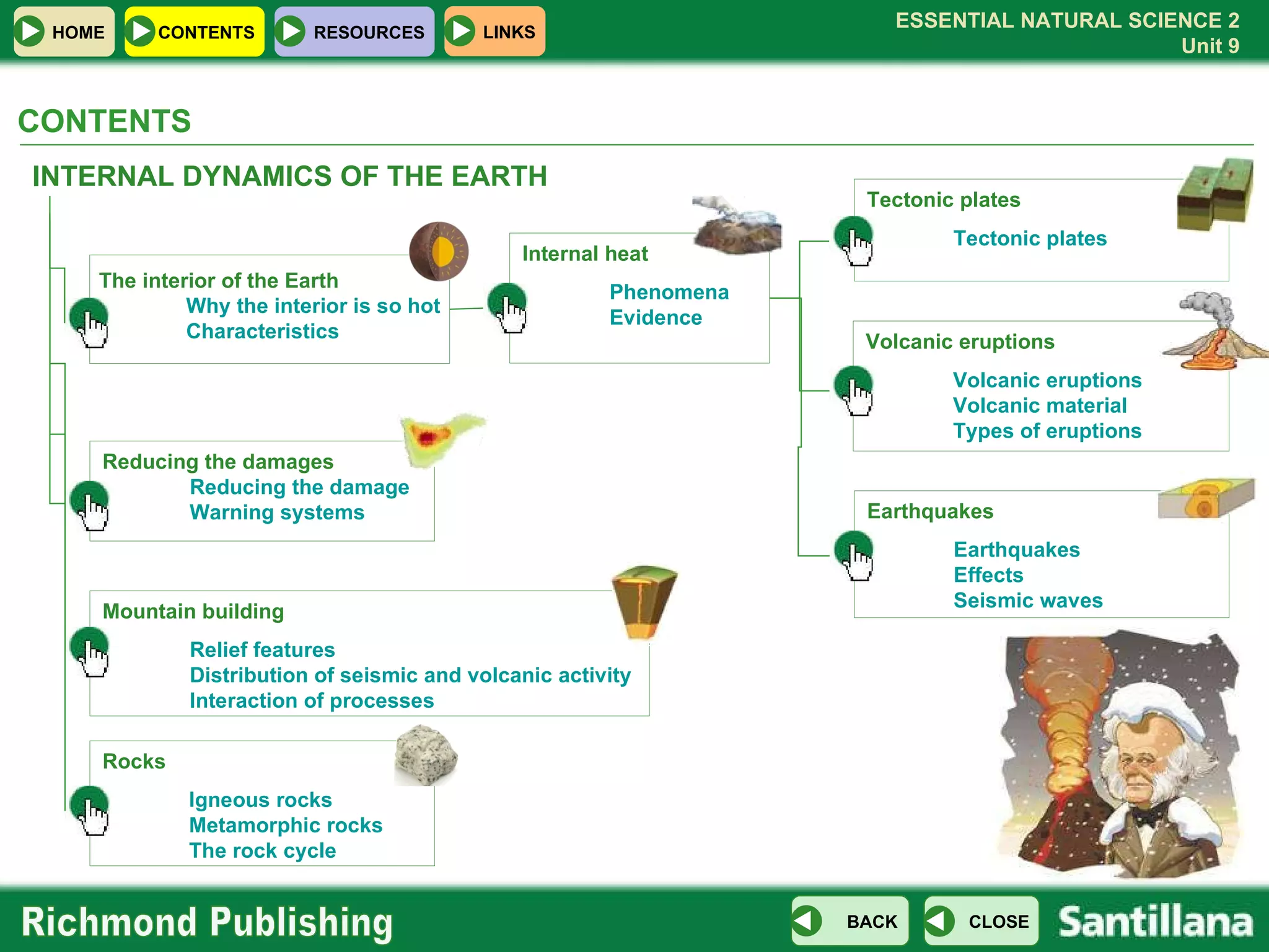 The document discusses the internal structure and dynamics of the Earth. It describes how the Earth's interior is very hot due to radioactive decay and gravitational settling. It explains plate tectonics and how the movement of tectonic plates results in volcanic eruptions and earthquakes. It also discusses different rock types, the rock cycle, and landform features related to tectonic activity.