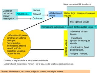 Mapa conceptual U1.Introducció Capacitat natural de produir missatges? Actualment... Càmera Televisió Ordinador .. Alfabetització Visual Saber llegir i escriure missatges visuals Impressions subjectives + estudi del llenguatge visual = - Elements visuals bàsics. Estratègies i opcions de tècniques visuals. Implicacions fisio i psicològiques. Mitjans i formats. L'alfabetització pretén construir un sistema bàsic per l'aprenentatge, identificació, creació i identificació de missatges visuals a l’abast de tots. Sintaxis Visual Comenta la següent frase al teu quadern de bitàcola: La reproducció mecànica de l’entorn , per si sola, no és una bona declaració visual. Intel·ligència visual Glossari: Alfabetització, art, símbol, subjectiu, objectiu, estratègia, sintaxis.