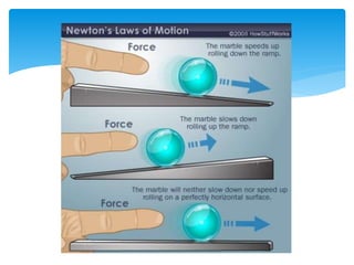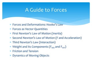 Forces act on objects and can cause changes in motion or shape. Hooke's law states that the force needed to extend or compress a spring is proportional to the distance changed. Forces are vector quantities that combine according to geometric rules. Newton's three laws of motion describe how forces cause changes in motion: the first law states an object in motion stays in motion unless acted on by a net force, the second law relates net force, mass, and acceleration, and the third law states that every force induces an equal and opposite reaction force. Friction and tension are types of contact forces that influence motion. Dynamics problems apply Newton's laws to analyze forces and motion in physical situations.