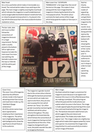 The document analyzes the cover design of a Q magazine issue featuring U2. The masthead uses an eye-catching red and white color scheme and distinctive Q logo. The large "U2 EXPLAIN THEMSELEVES" cover line in white contrasts with the black and white photo to draw attention. The photo depicts the band members in dark suits, taken from a low angle to portray them as powerful icons. Additional text and design elements like cover lines, barcodes and a skyline are used to advertise articles, strengthen the brand identity, and promote future issues and sales.