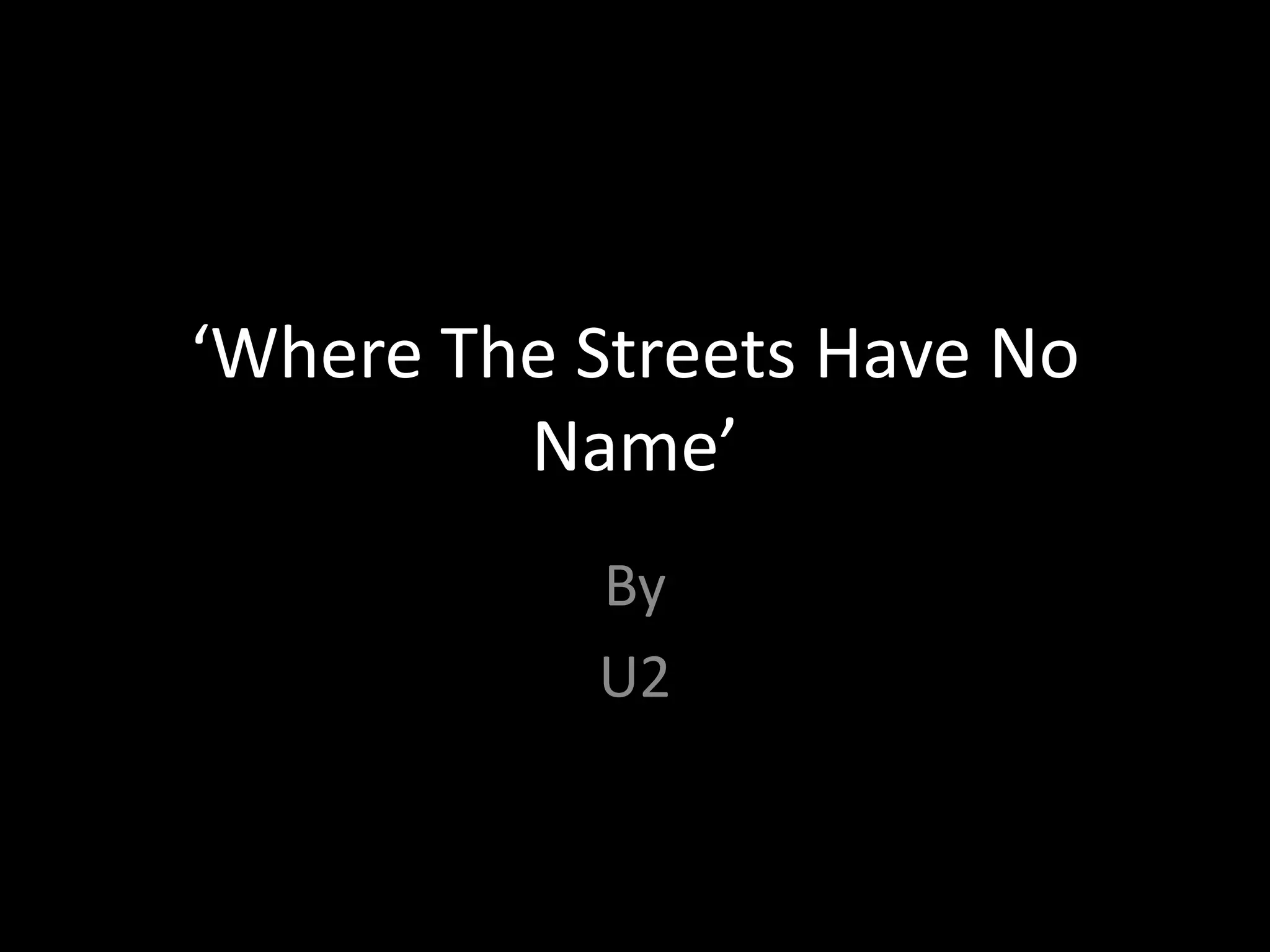 The document summarizes the music video for U2's song "Where The Streets Have No Name". It describes how the video was filmed without authorization on the roof of a liquor store in LA and attracted a large crowd. During the shoot, U2 performed an eight song set before being shut down by authorities. The video captures the raw, unstaged events as they unfolded. It goes on to analyze camera shots and angles used in the video that highlight the band and fan interaction. The video was well received and won a Grammy for best music video.