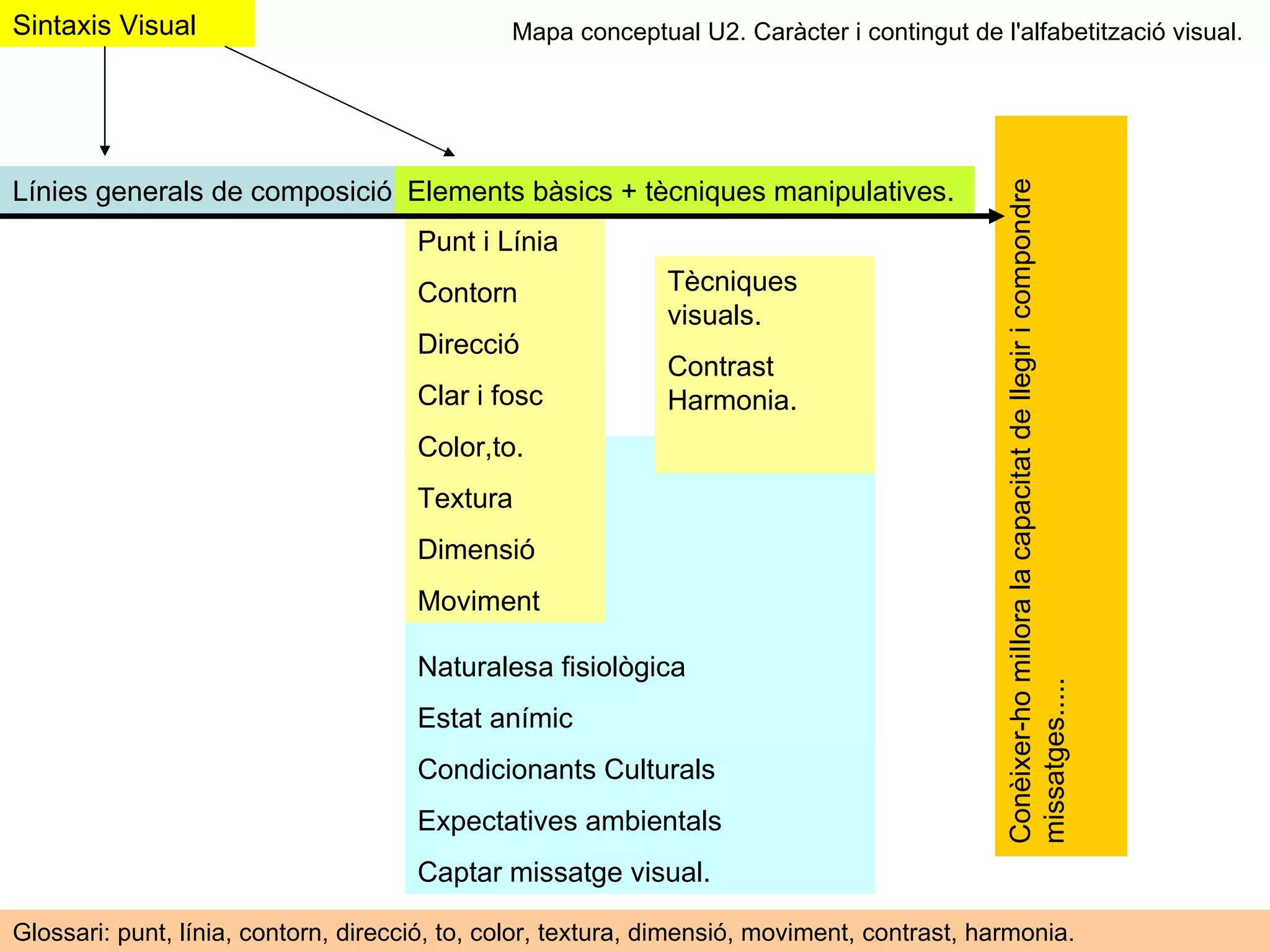 Mapa conceptual U2.Caràcter i contingut de l'alfabetització visual. Sintaxis Visual Línies generals de composició Elements bàsics + tècniques manipulatives. Conèixer-ho miIlora la capacitat de llegir i compondre missatges..... Naturalesa fisiològica Estat anímic Condicionants Culturals Expectatives ambientals Captar missatge visual. Punt i Línia Contorn Direcció Clar i fosc Color,to. Textura Dimensió Moviment Tècniques visuals. Contrast Harmonia. Glossari: punt, línia, contorn, direcció, to, color, textura, dimensió, moviment, contrast, harmonia.
