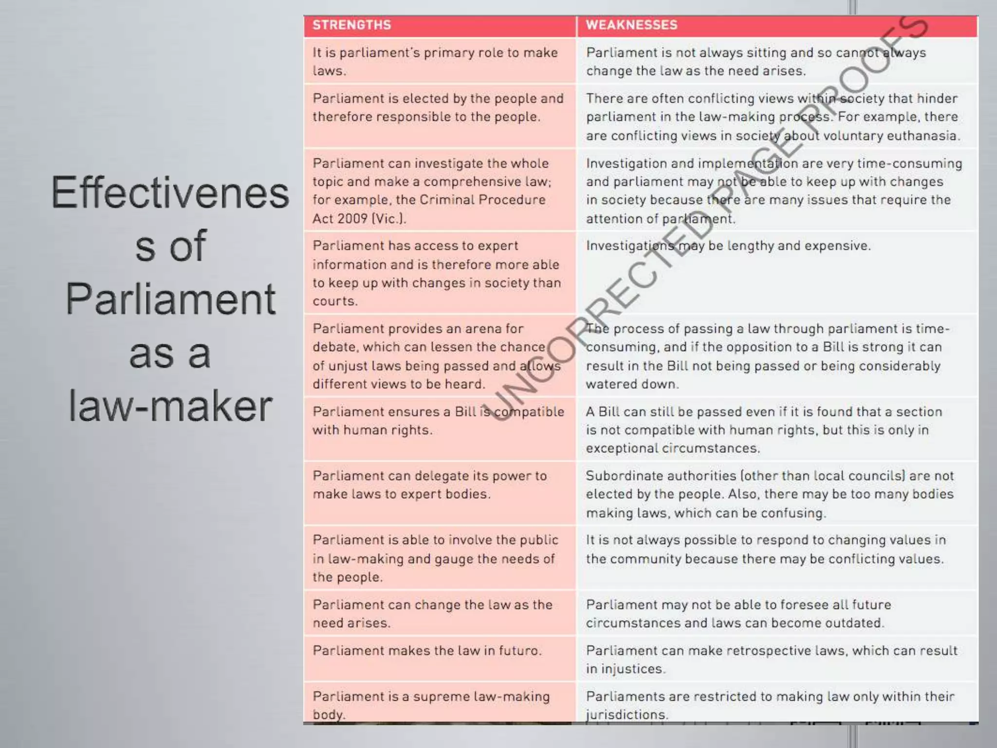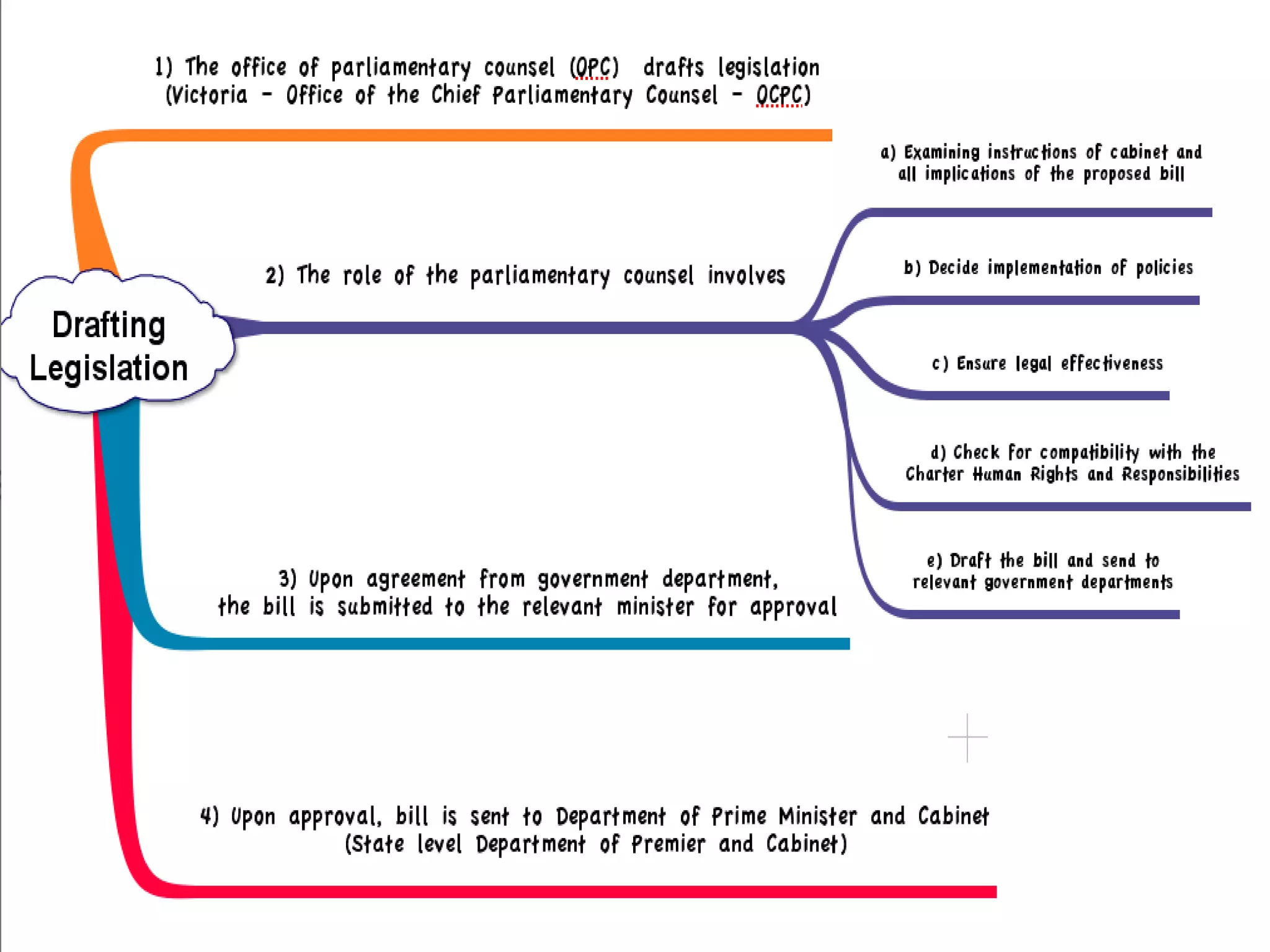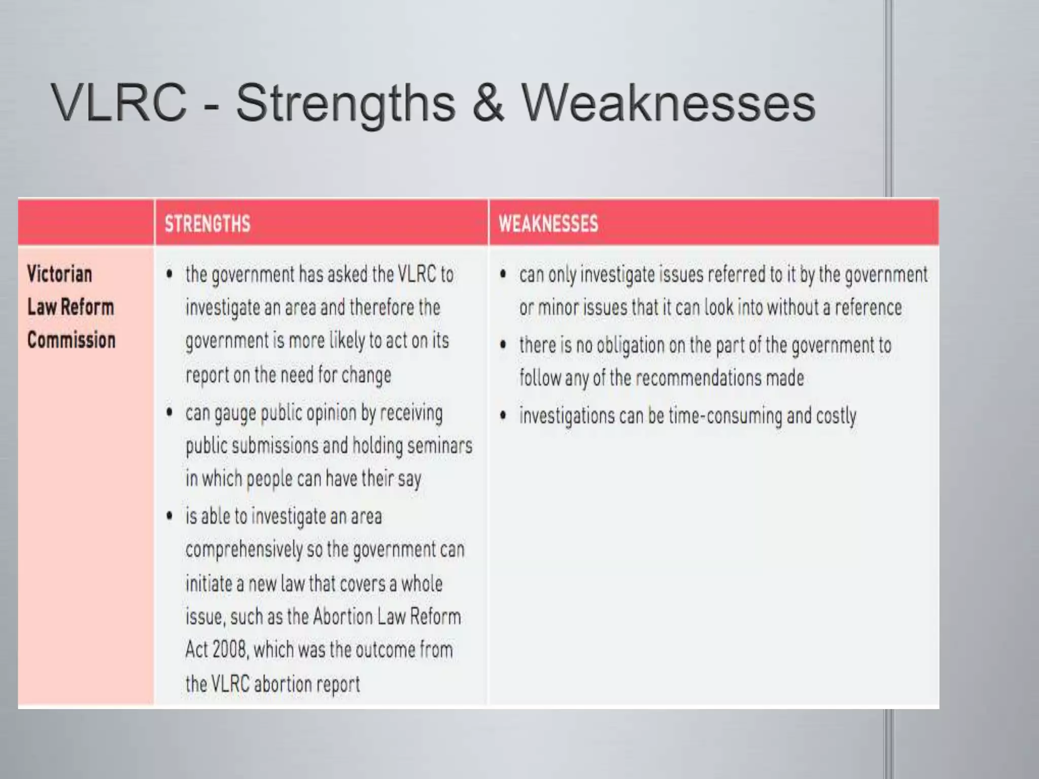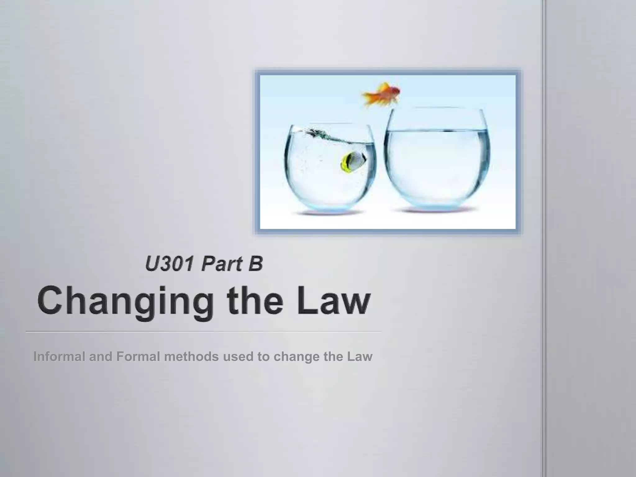 The document discusses reasons why laws may need to change, including changing societal values and advances in technology. It describes informal methods like petitions, demonstrations, and media campaigns as well as formal processes through bodies like the Victorian Law Reform Commission. The legislative process is outlined, beginning with a bill's introduction and progressing through readings, committee scrutiny, and votes in both houses of parliament. Royal assent and proclamation bring the new law into force.