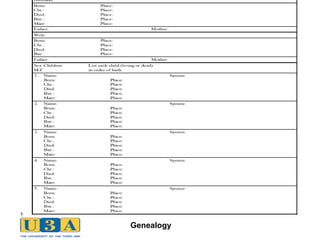 The document introduces the University of the Third Age (u3a) in the UK, detailing its purpose as a self-managed learning cooperative for older people. It provides guidance on family history research, emphasizing the importance of documenting lineage, utilizing primary sources, and being organized in the process. It also covers various types of records and resources useful for genealogical research, including civil registration, census data, and online tools.