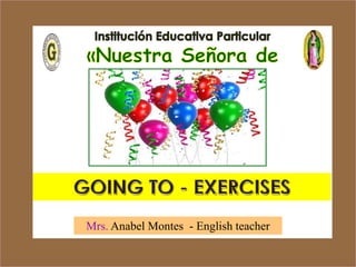 The document provides a grammar exercise where students are asked to form sentences using "going to" based on prompts. For several prompts, students are asked to form negative sentences using "not going to". The prompts cover a variety of actions including playing soccer, studying, eating, traveling, finishing a relationship, writing on walls, eating in class, going to the cinema, visiting grandparents, and a dog running in a competition.