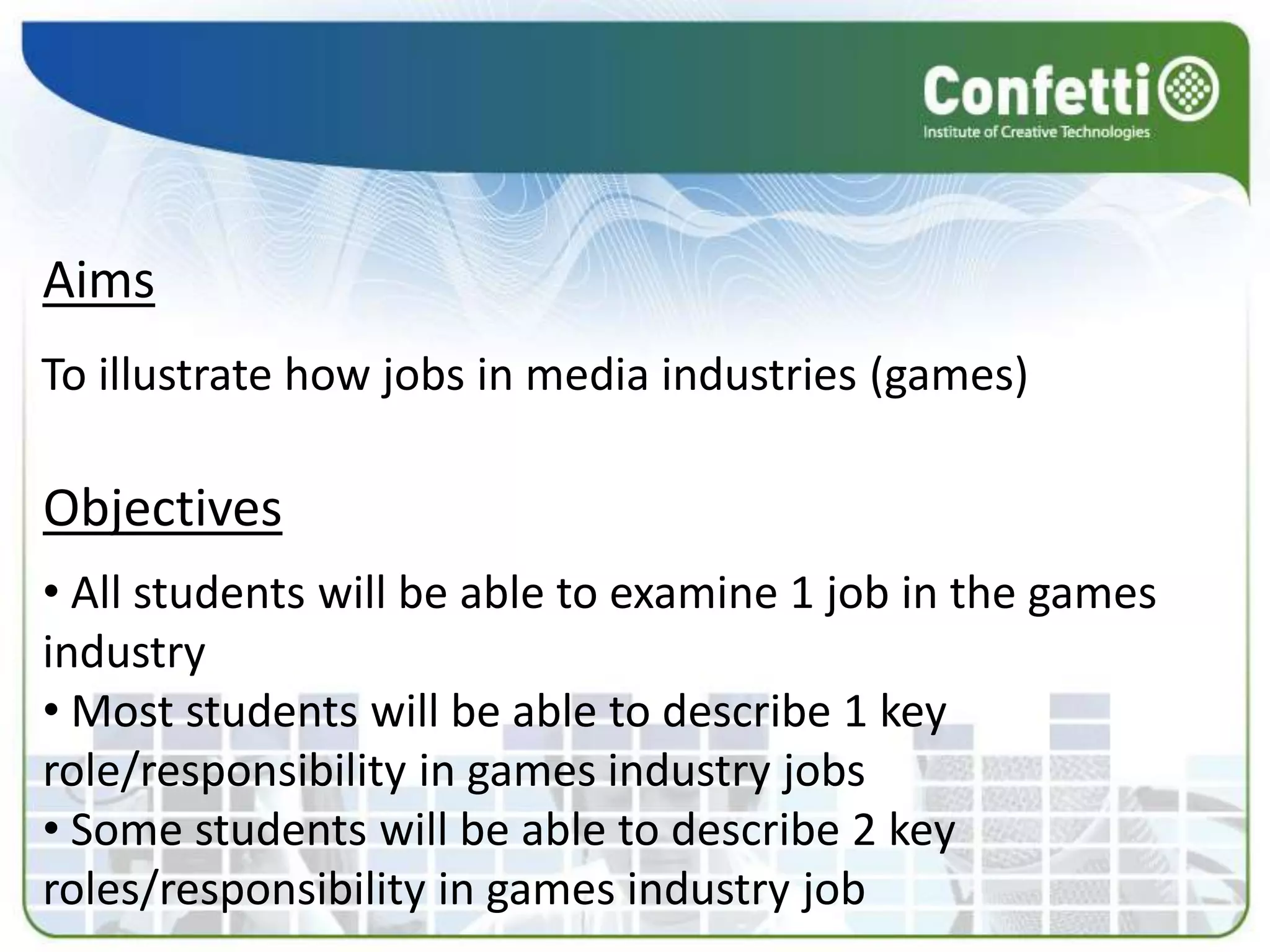 - It lists several common jobs in games like engineer programmer, designer, animator, voice director, producer, and artist.
