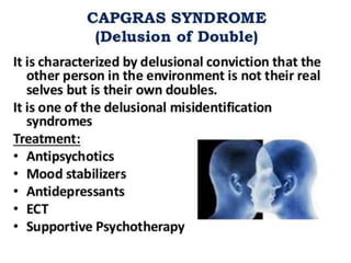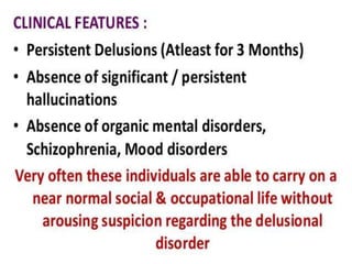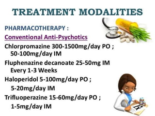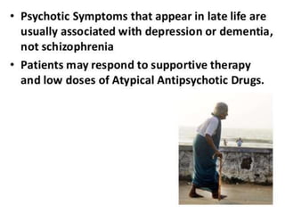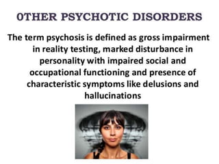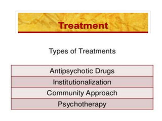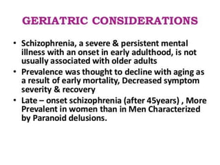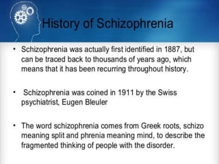 Schizophrenia is a psychotic disorder characterized by disturbances in thinking, emotions, and behavior. There are several proposed causes including genetic, biochemical, and environmental factors. Symptoms are classified as positive (e.g. delusions, hallucinations) or negative (e.g. reduced speech, lack of motivation). Schizophrenia is further classified into subtypes based on symptoms such as paranoid, disorganized, or catatonic. Prognosis depends on factors like symptom severity, onset age, and social support. Nursing diagnoses for those with schizophrenia may include disturbances in thought processes and difficulties with self-care.