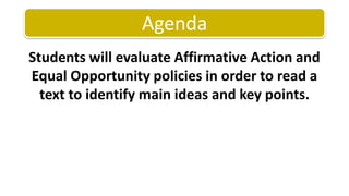 This document contains an agenda for a class that will discuss affirmative action and equal opportunity policies. The class will include a warm-up, objectives, and readings about key topics. Students will read about affirmative action, its goals of promoting educational and economic opportunities for women and minorities, and equal opportunity laws' requirement of fair treatment. They will practice identifying main ideas and supporting details. Homework includes finishing the in-class readings and discussions.