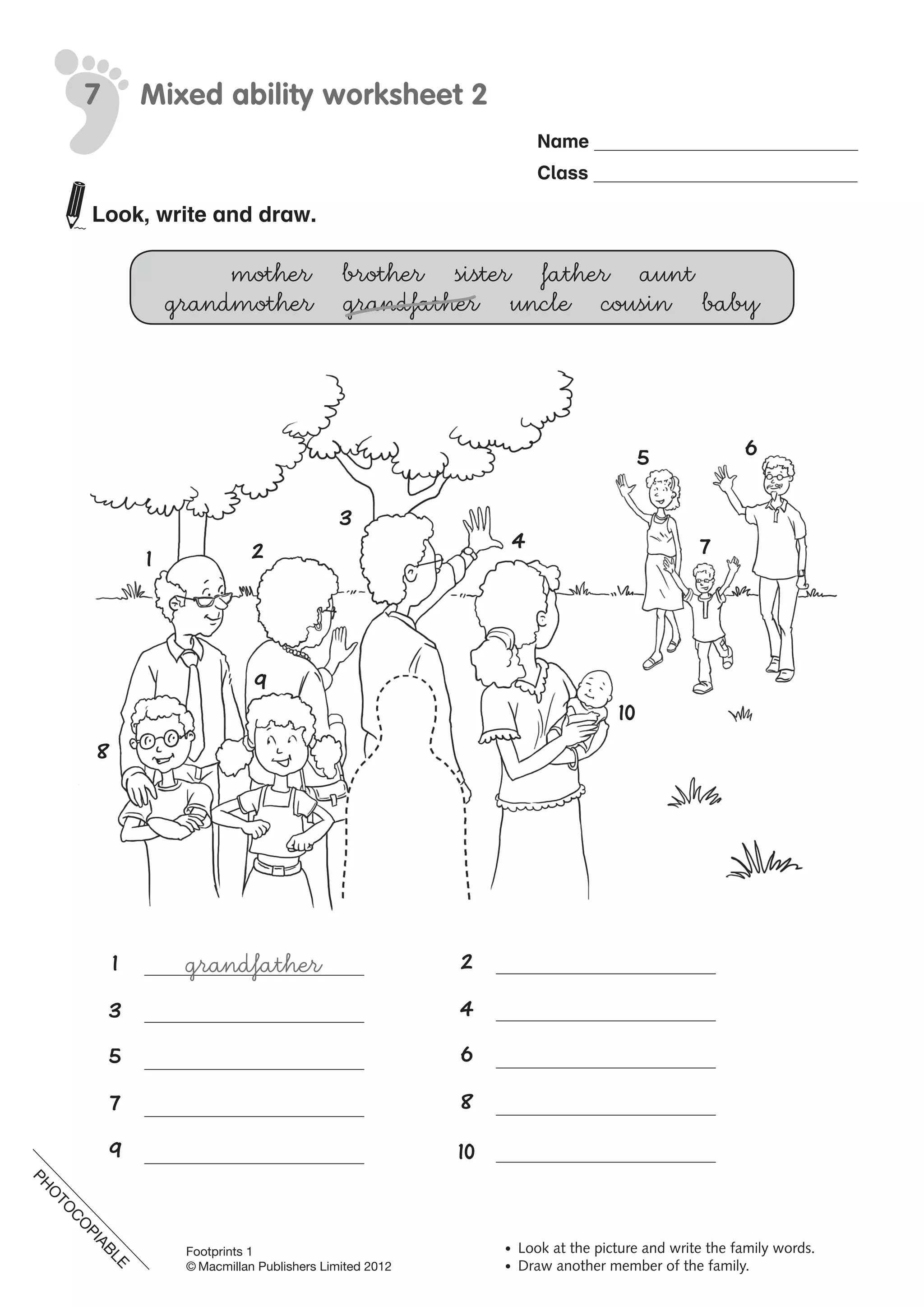 This worksheet asks students to look at a picture of a family, write words describing family members they see, and draw another family member. Students are shown a picture and prompted to label 10 family members they identify such as mother, father, brother, sister, grandmother, grandfather, aunt, uncle, cousin, and baby. They are then asked to draw another family member not shown in the picture.