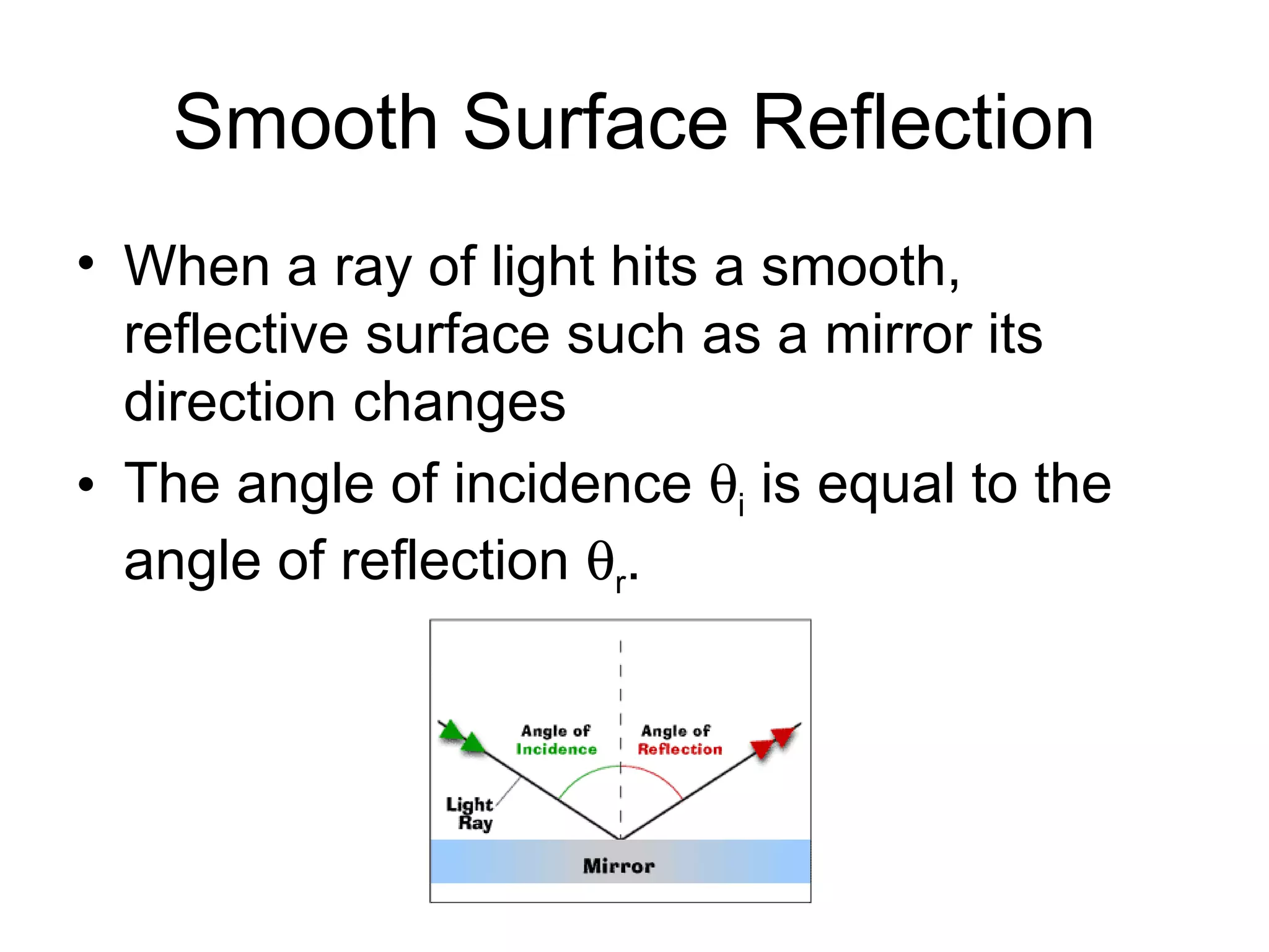 The document discusses reflection of light from surfaces. It explains that smooth surfaces like mirrors cause specular reflection where the angle of incidence equals the angle of reflection. Rough surfaces scatter light in many directions, causing diffuse reflection. The document demonstrates how to use ray tracing to locate images formed by reflection by drawing light rays reflecting off a mirror according to the law of reflection.