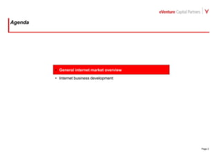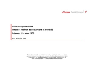 This document provides a summary of the internet market in Ukraine from a presentation by eVenture Capital Partners. It outlines that Ukraine has high internet growth but lower penetration compared to large European markets. Key points include that high-speed internet access in Ukraine is growing rapidly, e-commerce is growing 60% annually but still nascent, and online advertising is one of the fastest growing markets in Ukraine. The document proposes categorizing venture deals and analyzes which business models like transactions, advertising, subscriptions, and communities are more or less developed in Ukraine.