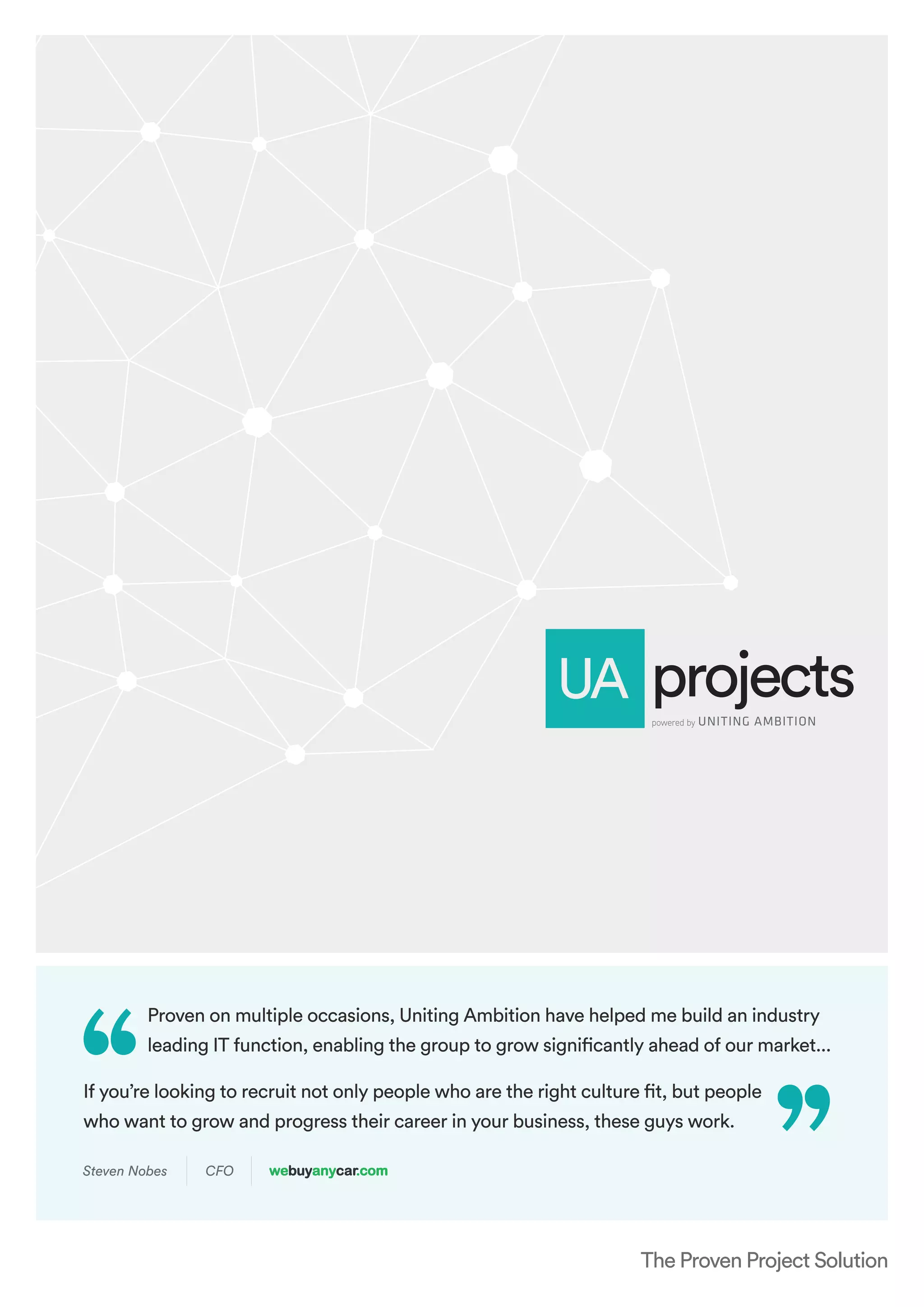 The document outlines UA Projects, a talent solutions partnership that helps businesses build high-performing teams and find niche technology talent for various projects. It highlights successful collaborations with major clients like Reckitt Benckiser and Next, illustrating UA's ability to integrate into existing frameworks and deliver customized recruitment solutions. Testimonials from satisfied clients emphasize the effectiveness of UA's consultative approach and extensive talent network.