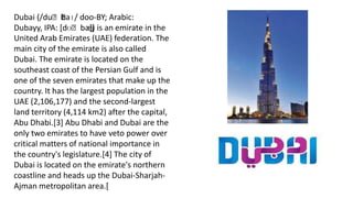 The document provides information about the seven emirates that make up the United Arab Emirates (UAE). It describes the location and key facts about each individual emirate: Abu Dhabi, Dubai, Sharjah, Ras al-Khaimah, Ajman, Umm al-Quwain, and Fujairah. It discusses the population sizes, ruling families, and historical developments of each emirate.