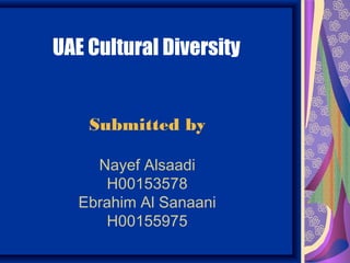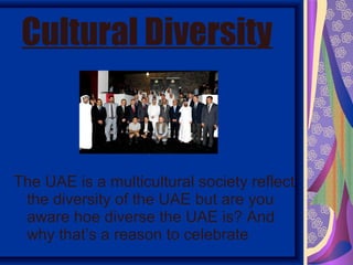 The UAE population is highly diverse, with over 200 nationalities represented. Approximately 50% of residents are South Asian and 23% are other Arab or Iranian. This diversity is a strength and provides rich cultural experiences. However, people often associate with others who are similar. To appreciate diversity, one should seek to understand different cultures, respect all people, and avoid prejudice and discrimination. Fostering positive relationships with those different than yourself broadens perspectives.