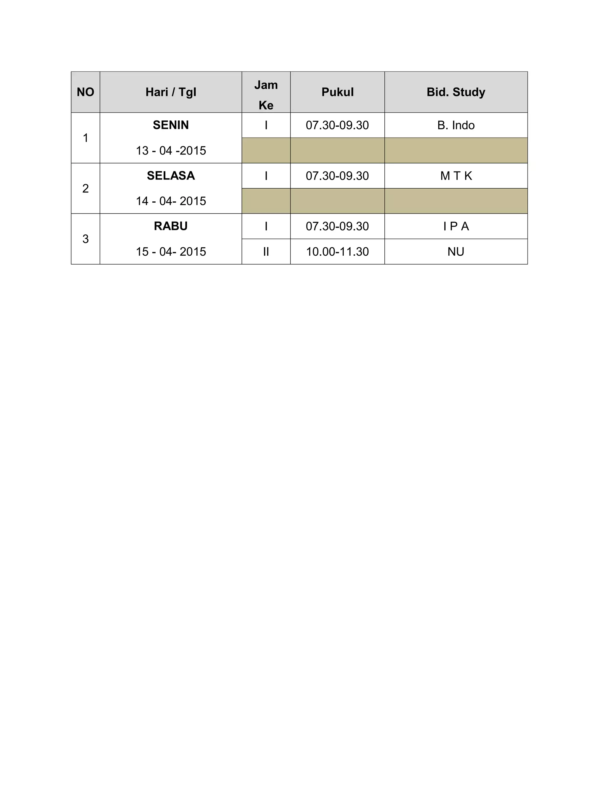 This schedule outlines 3 study sessions taking place from Monday to Wednesday the weeks of April 13-15, 2015. On Monday there is a Bahasa Indonesia class from 7:30-9:30, on Tuesday a Mathematics/Science/Technology class from 7:30-9:30, and on Wednesday a Civics class from 7:30-9:30 and Religion class from 10-11:30.