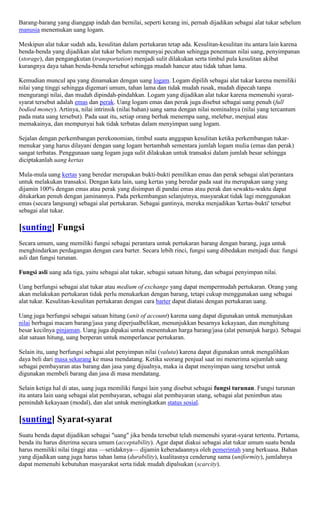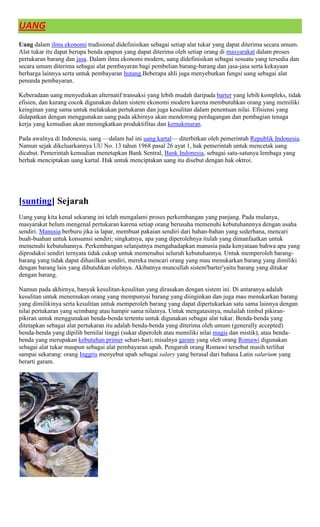 Uang dapat didefinisikan sebagai alat tukar yang umum diterima dalam pertukaran barang dan jasa. Uang berfungsi sebagai alat tukar, satuan hitung, dan penyimpan nilai. Berbagai jenis uang yang pernah ada meliputi uang logam, uang kertas, serta uang berdasarkan nilainya seperti uang penuh dan uang tanda.