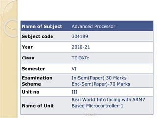 This document provides information about interfacing an ARM7 microcontroller with a UART module. It begins with course objectives and outcomes related to real-world interfacing. It then describes the basic operation and frame structure of UART serial communication. Details are given about the UART module and registers on the LPC2148 microcontroller, including how to configure pins for UART functionality and set the baud rate. An algorithm is provided to transmit and receive data through the UART using various register commands.