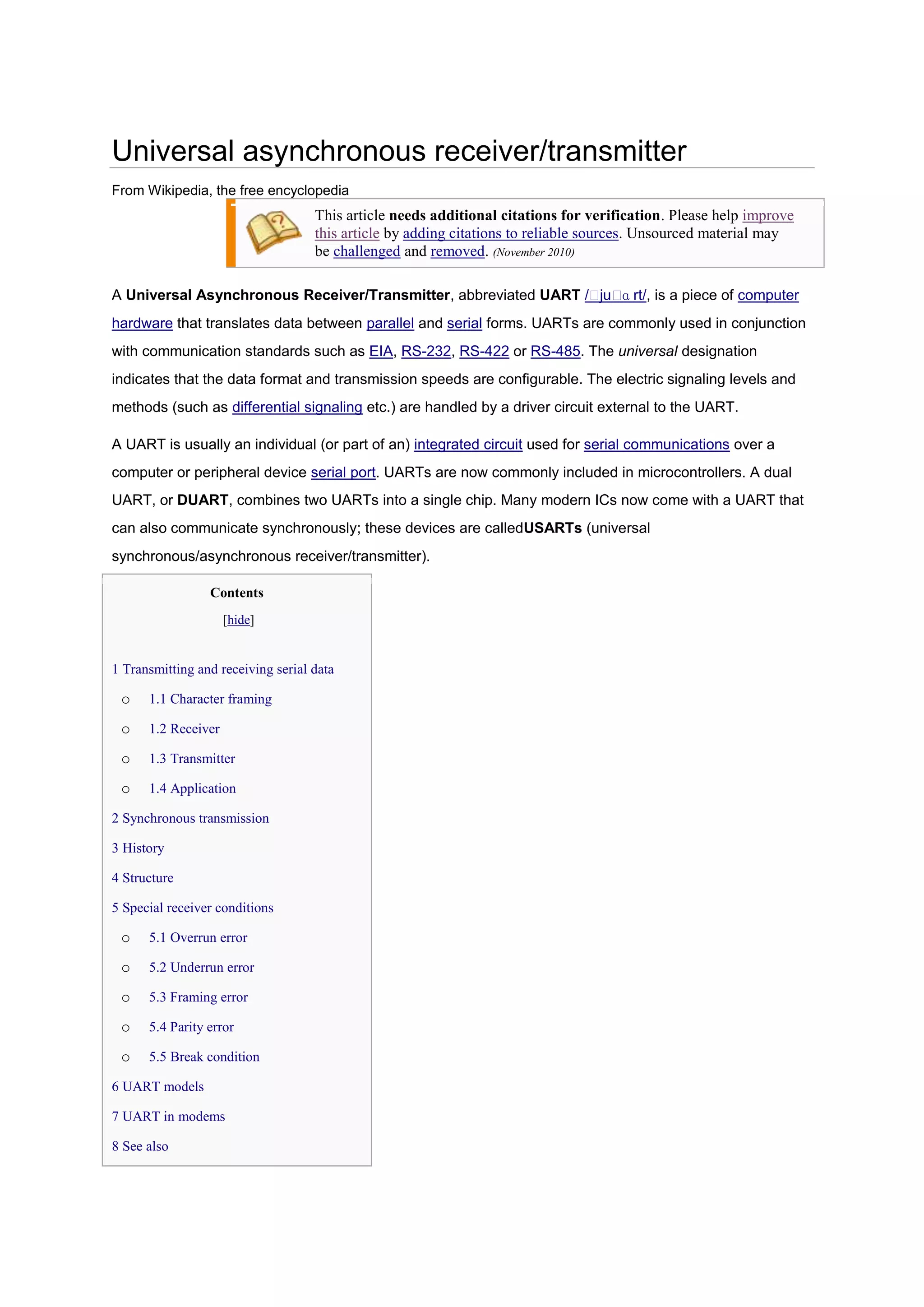 A Universal Asynchronous Receiver/Transmitter (UART) is a computer hardware device that translates data between parallel and serial forms, enabling serial communication. A UART takes bytes of data and transmits the individual bits sequentially. At the destination, another UART reassembles the bits into complete bytes. UARTs are commonly used with communication standards like RS-232 and protocols like EIA to enable serial communication between computers and peripheral devices.