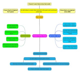 The document discusses the present perfect tense and how it is used to talk about actions or experiences that began in the past and continue in the present or that have happened multiple times up until now. Specifically, it provides examples of using the present perfect tense with time expressions like "up to now", "so far", "yet/ever/never", "for/since", and "already/just/recently" to discuss actions that have occurred or a state that has continued over a period of time leading up to the present.