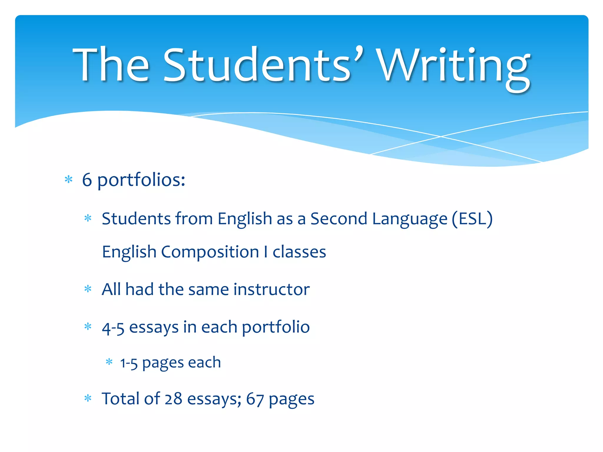 The document presents a study examining grammatical errors of non-native English writers in first-year composition courses, focusing on portfolios from ESL students. The analysis identifies the top five errors—word choice, missing commas, articles, tense shifts, and prepositions—highlighting differences between this study and prior research by Lunsford & Lunsford. It underscores the importance of understanding these errors for composition instructors and suggests a potential correlation between mistake frequency and revision efforts.