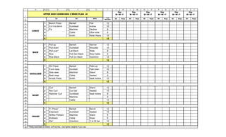 This document contains a 4 week upper body workout plan that includes exercises for the chest, back, shoulders, biceps, and triceps. The plan lists 6 exercises for each muscle group to be performed on a Monday, Wednesday, Friday schedule. Rep ranges and weight recommendations are not provided, but notes on form and injury risks are included for some exercises.