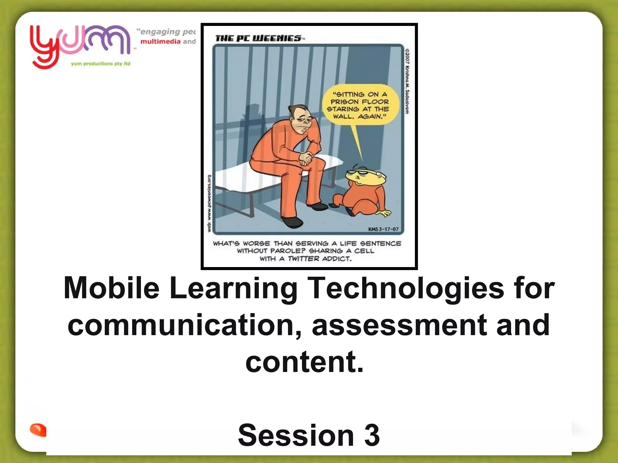 This document discusses using mobile learning technologies for communication, assessment, and content delivery. It introduces various tools that can be used including Moodle for resources and assessments, Mahara for project reflections, Dropbox for file sharing, and Twitter for communication. The document then provides more details on specific functions of these tools, such as adding content and assessments to Moodle, shooting and editing video, and using Twitter. It concludes by introducing a potential mobile learning project where students can use these tools for course communication, assessment evidence capture, and accessing mobile course content.