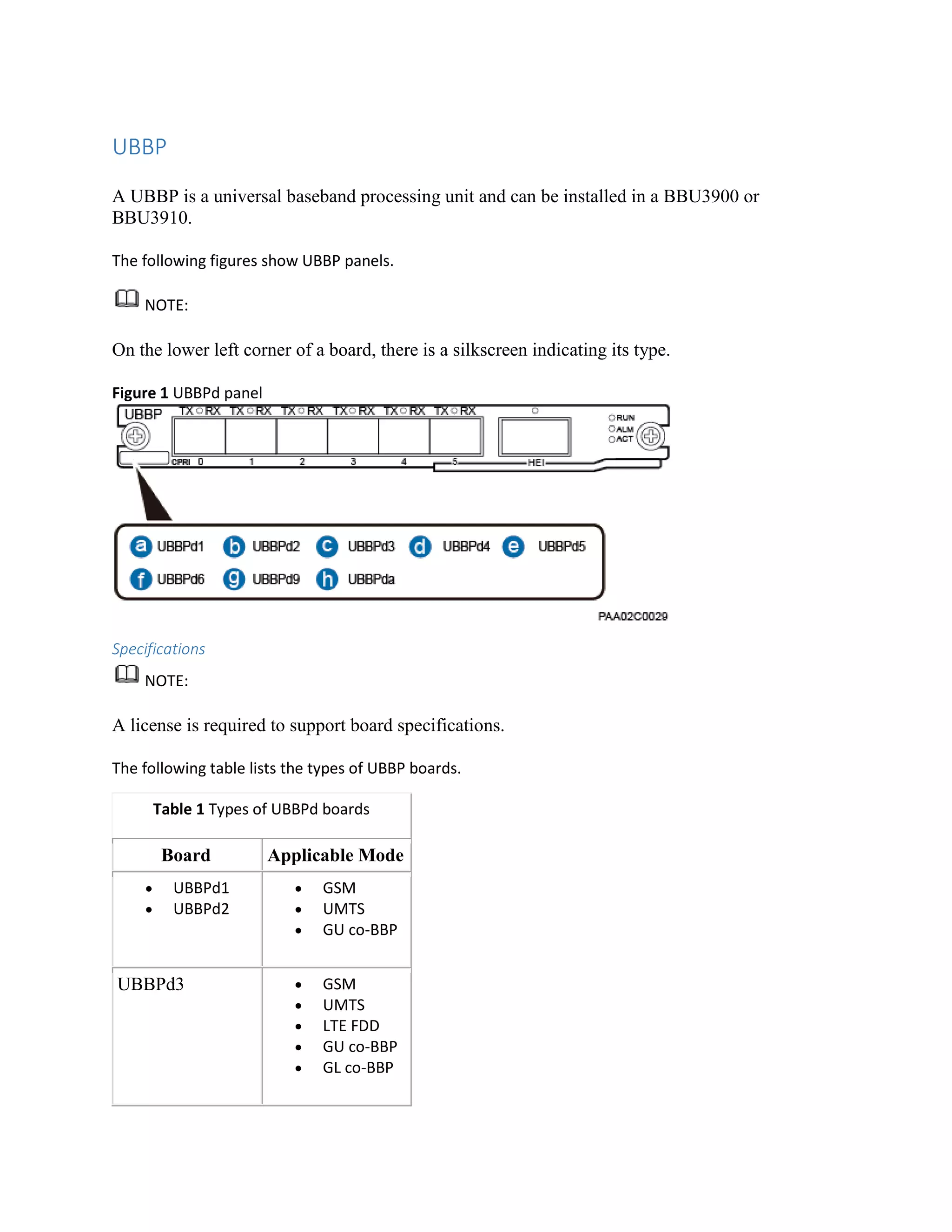 This document describes a universal baseband processing unit (UBBP) that can be installed in BBU3900 or BBU3910 base stations. It discusses the types of UBBP boards, their specifications for supporting different modes like GSM, UMTS, LTE, and the number of carriers, cells and throughput they can handle. Tables provide details on the board types, applicable modes, carrier and cell specifications, maximum throughput and UEs supported under different configurations.