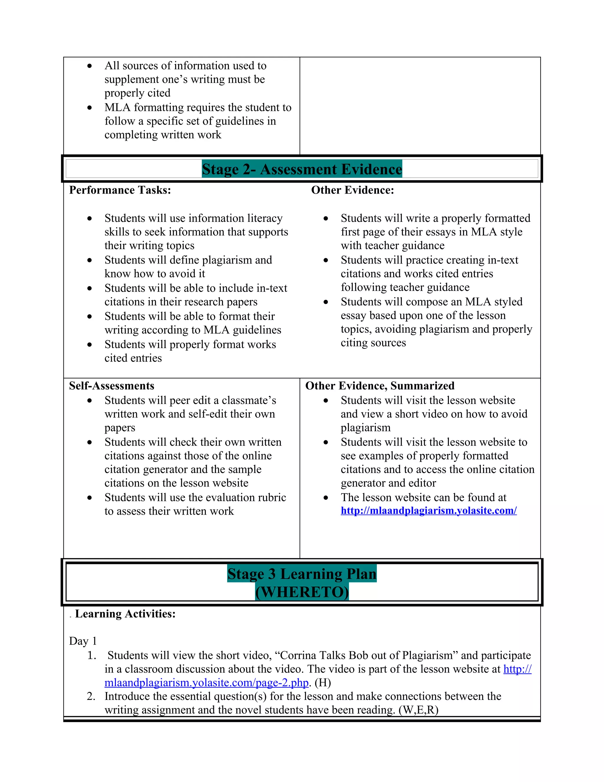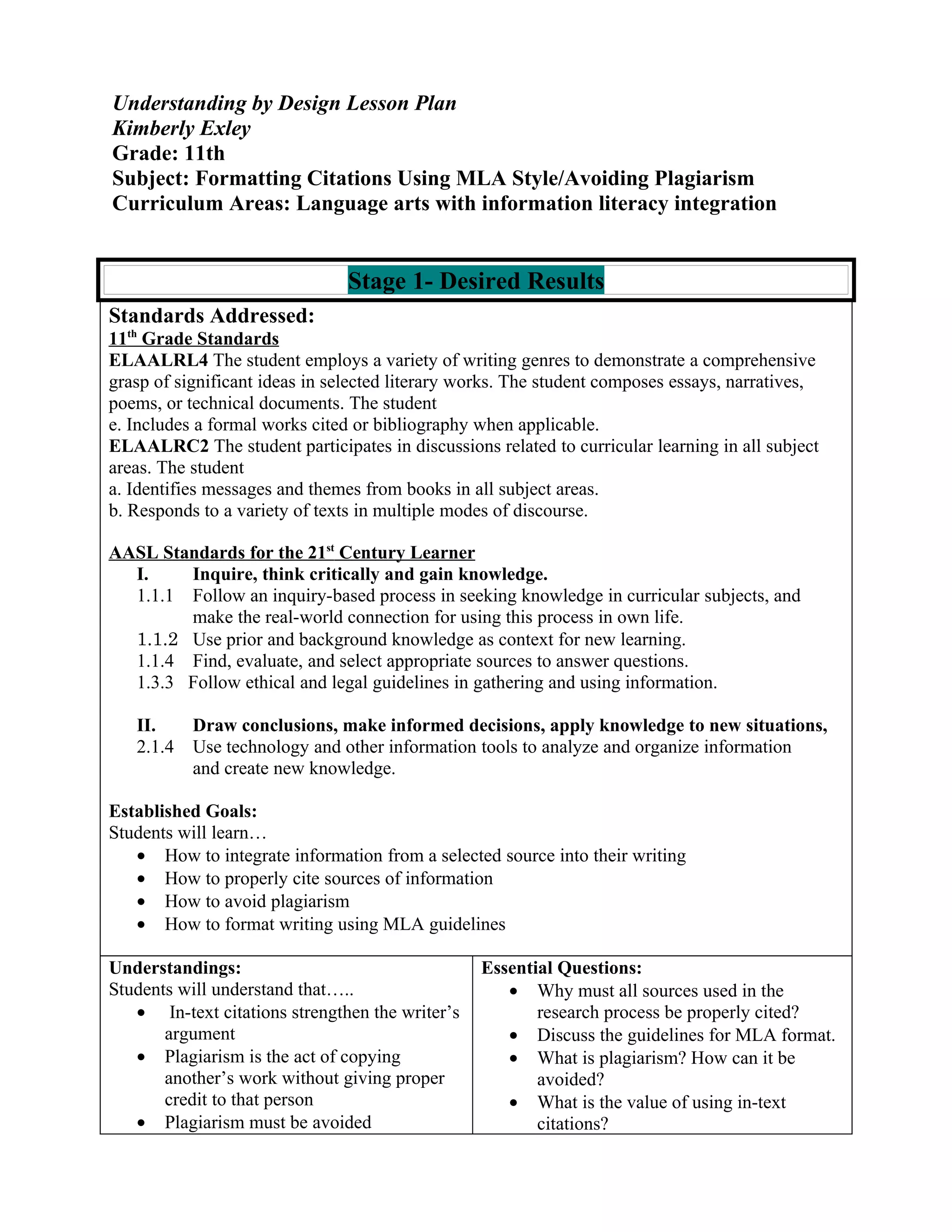 The document outlines an Understanding by Design lesson plan for an 11th grade class on properly formatting citations and avoiding plagiarism using MLA style, with learning activities that include viewing a video on plagiarism, practicing MLA formatting of citations and essays, composing an original MLA formatted essay on a chosen topic while citing sources, and peer reviewing classmates' work. The lesson aims to teach students information literacy skills and how to properly attribute sources in their writing.