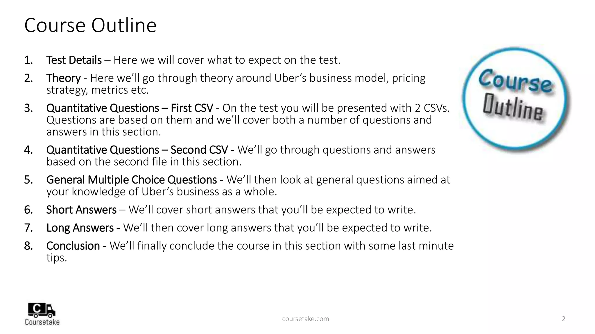 The document outlines a comprehensive course designed to prepare candidates for the Uber analytics test, which is crucial for various managerial positions. It details the test format, including the number and types of questions, as well as recommended time allocations for each section. Additionally, it covers essential theories behind Uber's business model, metrics, and pricing strategies, particularly focusing on surge pricing and its effects on demand and supply.