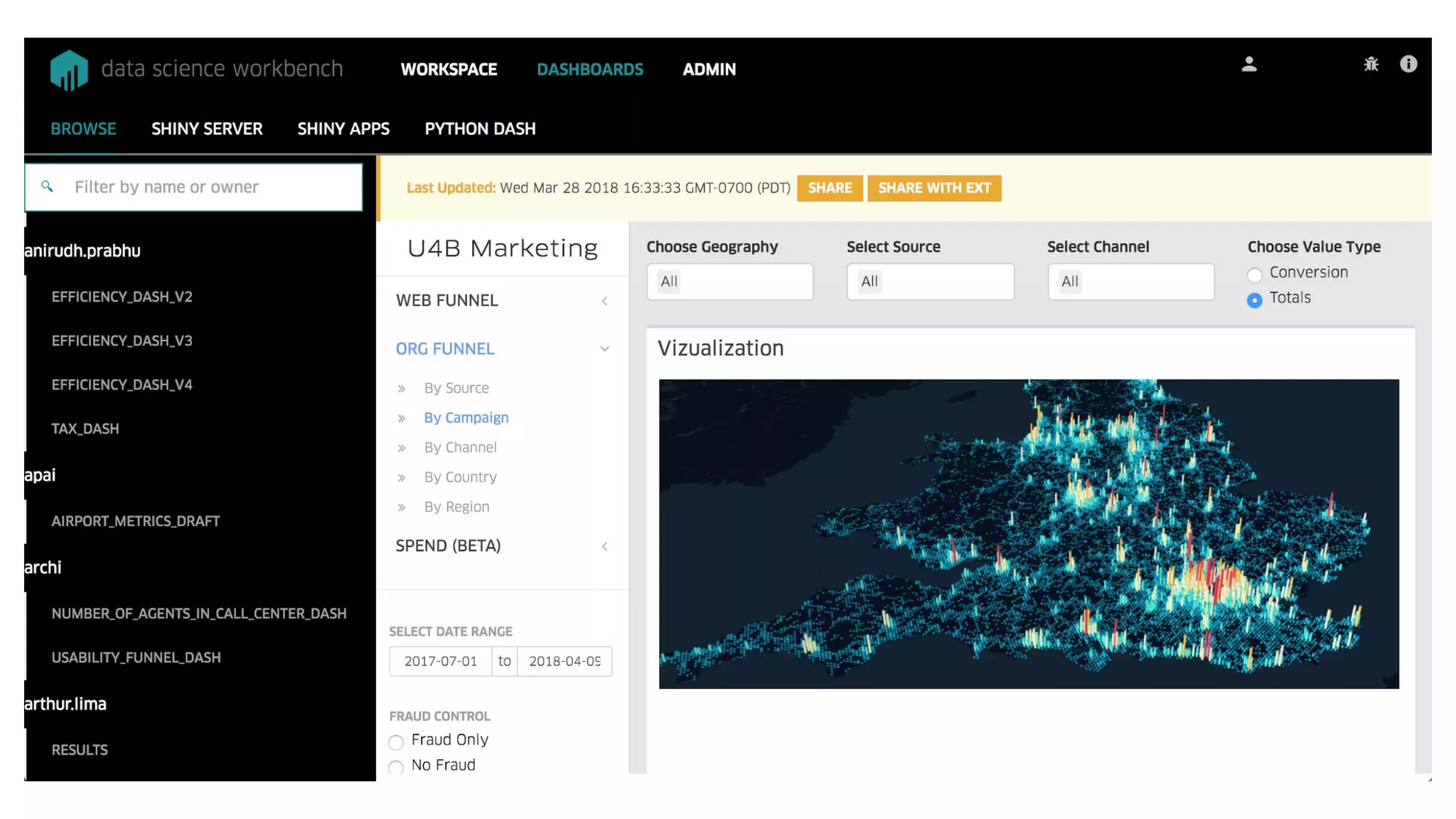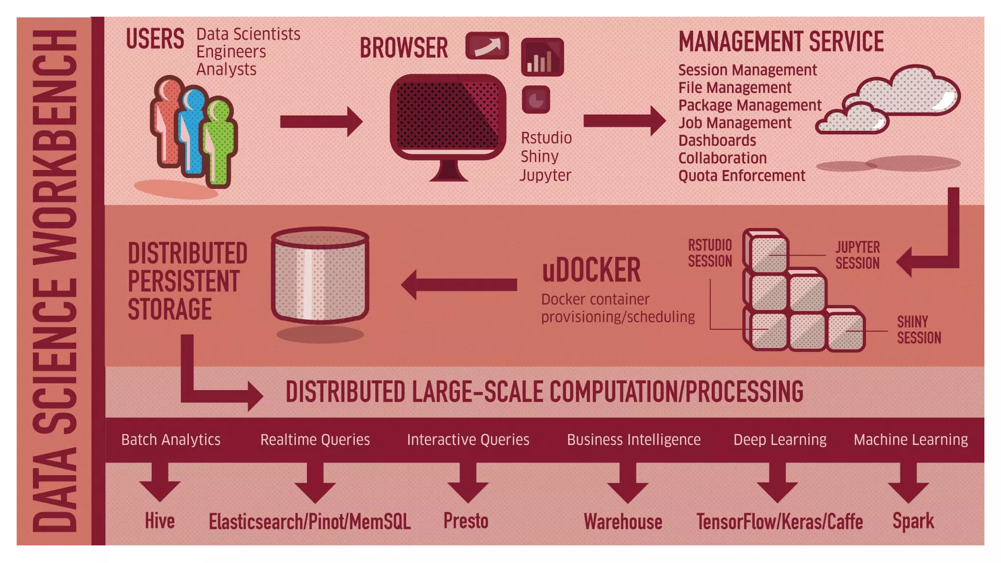 This document summarizes Uber's data science workbench (DSW), which provides scalable infrastructure, tools, customization, and support for Uber's large data science community. The DSW allows data scientists to access internal data sources and compute engines through Jupyter notebooks or RStudio IDEs in a secure, hosted environment. It helps standardize workflows and facilitates collaboration, publishing of results, and model deployment to production. The DSW integrates with Uber's Spark and machine learning systems to enable large-scale data exploration, parallelized model training, and evaluation at Uber's massive scale. It has supported a wide range of use cases across safety, risk, recommendations, and operations.