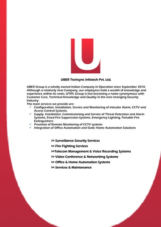 UBER Techsync Infotech Pvt. Ltd. is an Indian company established in 2010 that provides security, surveillance, fire safety, and automation services and products. It offers configuration, installation, service and monitoring of intruder alarms, CCTV and access control systems. The company also supplies, installs, commissions and services threat detection systems, fire suppression systems, emergency lighting, and portable fire extinguishers. Additionally, it provides remote monitoring of CCTV systems and integration of office and home automation solutions.