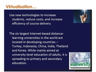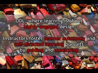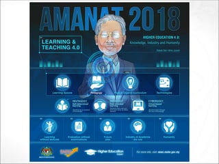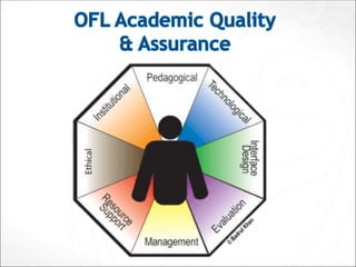 The document discusses the redesign of Malaysian higher education through new learning paradigms in open and flexible learning (OFL), emphasizing the democratization of education, flexible curricula, and accreditation of prior experiential learning. It raises questions about national quality assurance (QA) frameworks and their alignment with OFL standards, as well as the adaptability of OFL to diverse learner needs. Additionally, it highlights various tools and methods for enhancing teaching effectiveness and the importance of integrating technology in educational practices.