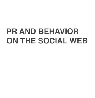 This document discusses public relations and building relationships through social media. It defines PR as the strategic management of communication relationships between an organization and its publics. It also discusses how relationships form online through shared values and behaviors. Strategies are presented for building relationships on social media, including using the right channels for different contexts and publics, listening, adapting, and monitoring engagement. Tools are provided for measuring and monitoring conversations at both narrow and wide scopes. The goals of content publishing are discussed, such as behavior change, matching values, and strengthening relationships.