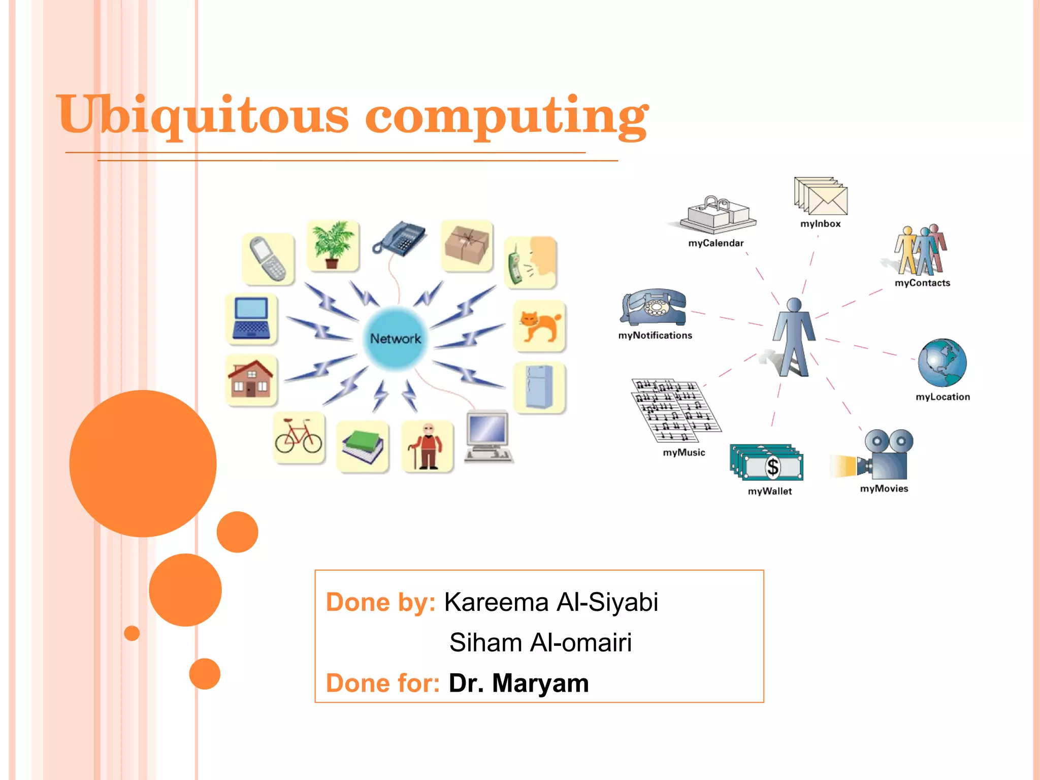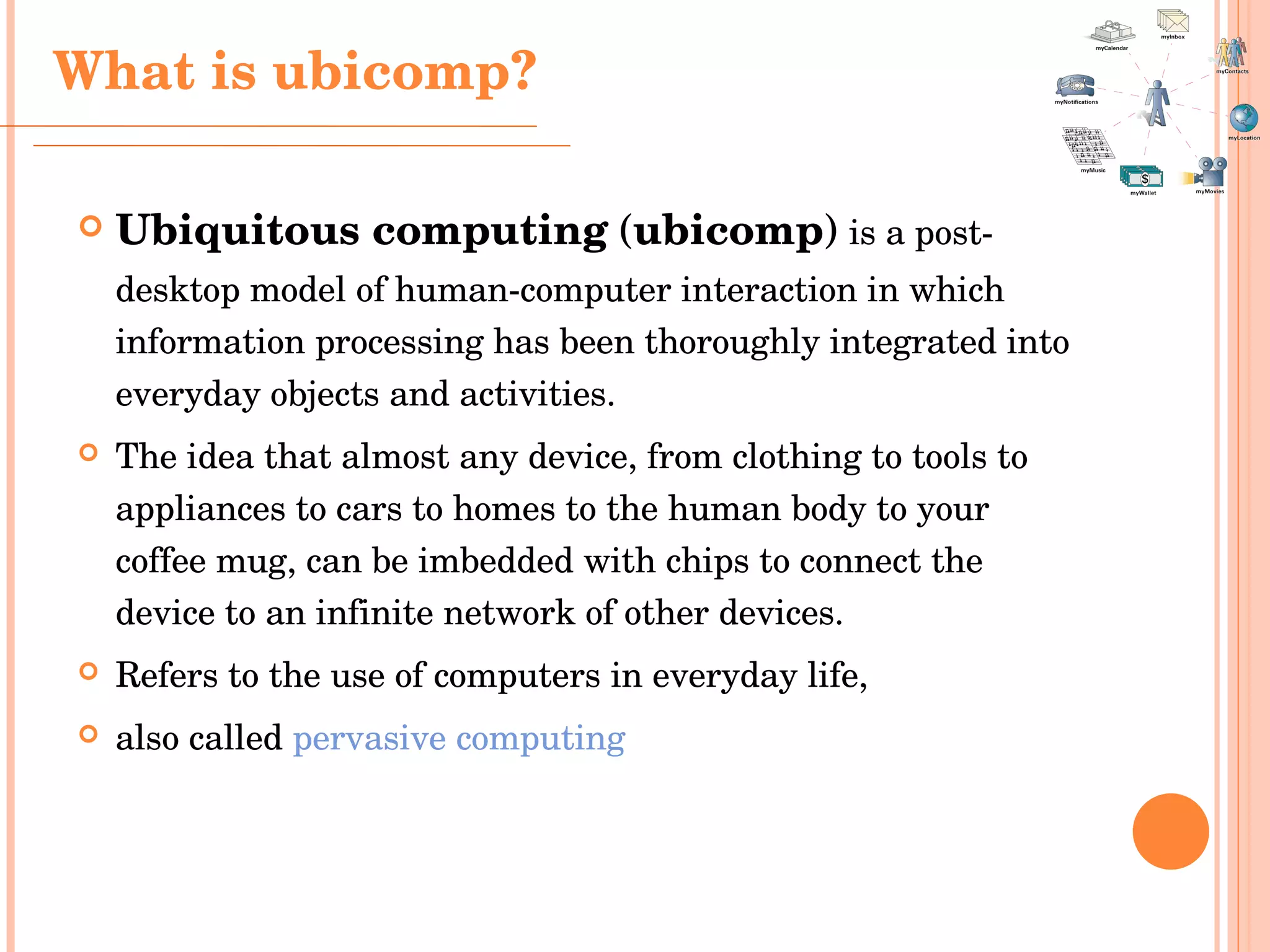 Ubiquitous computing (ubicomp) refers to computers integrated into everyday objects and activities. The goal is to create an environment where connectivity between devices is always available but unobtrusive. Examples of ubicomp devices include digital audio players, RFID tags, smartphones, and interactive whiteboards. Mark Weiser is considered the father of ubiquitous computing and coined the term in the 1980s.